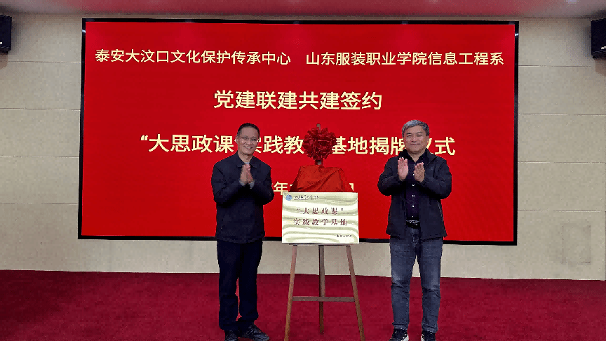 为深入学习践行习近平文化思想,引导师生深刻认识中华文明悠久历史,增强历史自觉、坚定文化自信,探索中华优秀传统文化与课程思政的融合路径,11月13日,山东服装职业学院信息工程系党总支组织师生赴泰安市大汶口遗址博物馆开展主题实践活动,在大汶口遗址博物馆建立“大思政课”实践教学基地,学院党委副书记韩西德为基地揭牌。信息工程系党总支党员教师、学生入党积极分子共40人参加活动。活动现场,大汶口文化保护传承中心党支部书记张保卫与信息工程系党总支书记刘凌共同签署《...