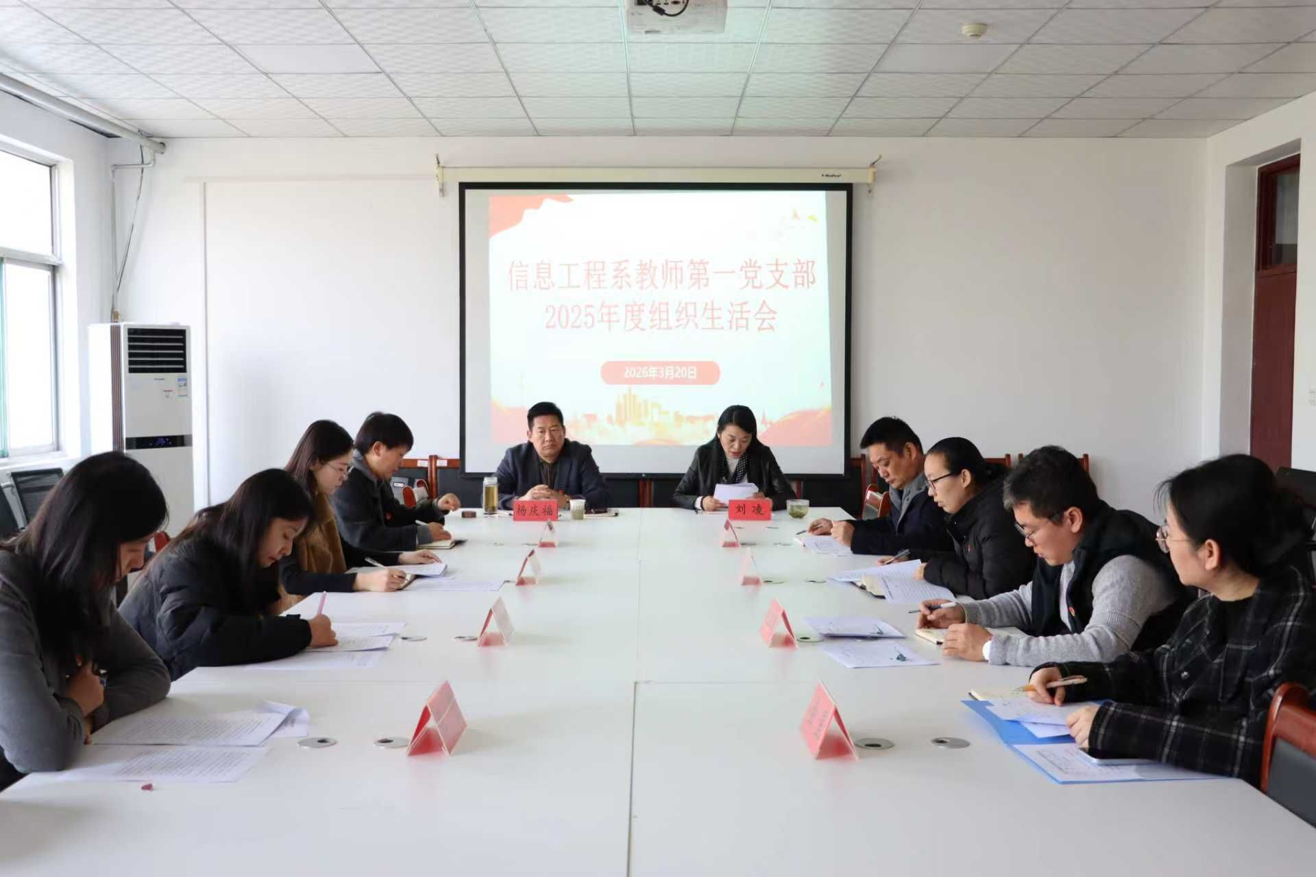 3月20日下午,信息工程系教师第一党支部召开2025年度组织生活会并开展民主评议党员工作。学院党委委员、党委(院长)办公室主任杨庆福到会指导,信息工程系党总支书记刘凌及党支部全体党员参加。会上,党支部书记首先通报了会议前期学习、谈心谈话、问题查摆等准备情况,代表支部委员会从理论武装、组织生活、党员管理监督等方面作对照检查,深入剖析问题根源。随后,党支部党员依次开展批评与自我批评,大家立足教师岗位实际,直面问题、...