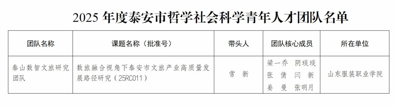 近日,泰安市社会科学界联合会发布《关于公布2025年度泰安市哲学社会科学青年人才团队名单的通知》,学院财经系“泰山数智文旅研究团队”成功入选,“数旅融合视角下泰安市文旅产业高质量发展路径研究”同步获批泰安市社会科学课题(青年人才专项)。