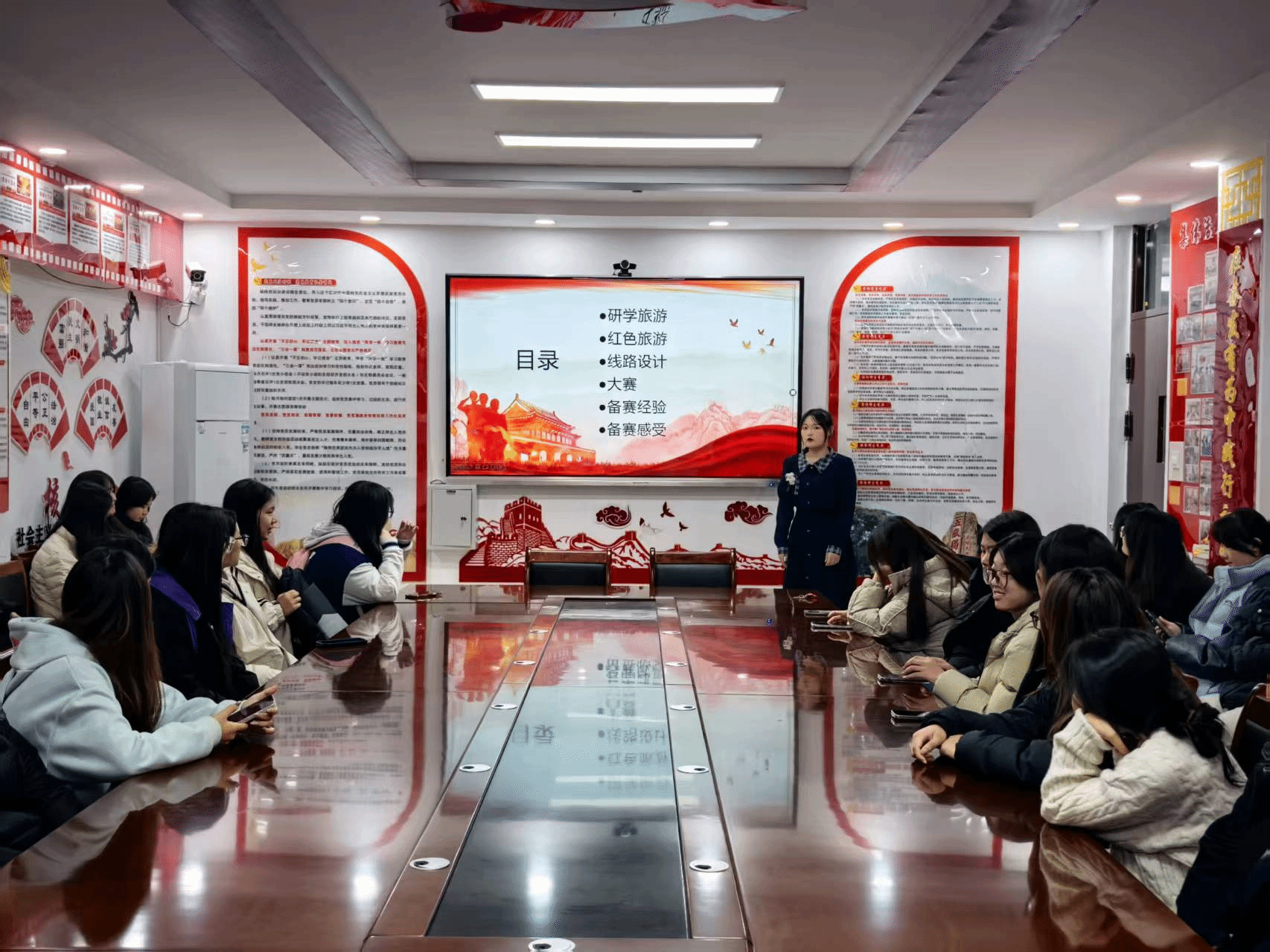交流会伊始,秦凤同学向大家分享了她的文旅学习之路——从课堂初识“以教育赋能旅途”理念,到深耕赛道成为兼具理论与实践经验的先行者,她在专业学习的旅途上用脚步丈量山河文脉、以专业诠释文旅价值。交流会上,秦凤主要讲解了研学旅游和红色旅游两块核心内容。研学旅游学习重点是将课本知识与真实场景结合,引导参与者亲身实践探索,在体验中深化认知、提升实践能力,培养主动学习思维。红色旅游核心是革命纪念地实景介绍与革命精神深度讲解,传递红色历史与先辈精神,传承红色基因,厚植爱国情怀,让红色精神融入生活。