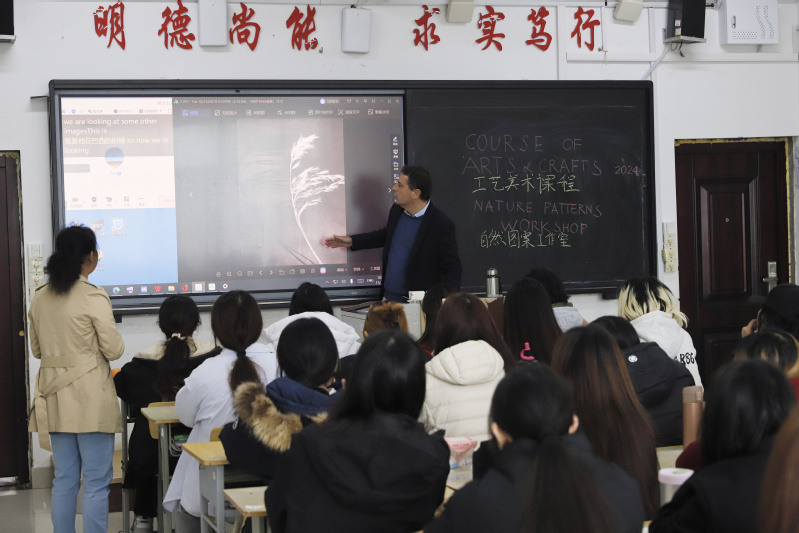 教授Franceso Santoro以生动的案例和深入浅出的讲解方式,向学生们展示了如何从大自然中汲取灵感,将自然界的美丽元素转化为设计中的独特图案。课堂上,学生们观察树叶的纹理、花朵的形态、鸟类的羽毛以及山川的轮廓,学习如何捕捉这些自然元素中的精髓,并通过艺术手法将其再现于画布或工艺品上。学生们积极展示了自己的作品,并与领导们进行了深入的交流和互动。