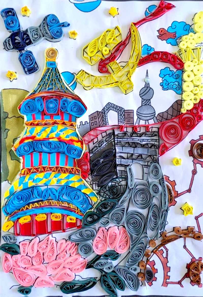 学生们基于服装平面立体化创作之上熟练掌握了各种基本部件的造型制作技巧和方法,衍纸制作过程也变得非常简单,做起来格外得心应手。衍纸技艺进课堂,不光让学生的衍纸设计孰能生巧,在创新创意制作中也表达了自己对红色经典的敬畏之心!