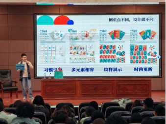 参观结束后,专题讲座《鲁锦“研学产”一体化保护性开发的山东模式》在旅游实训报告厅正式开讲,服装设计与表演系师生代表齐聚现场,共赴鲁锦文化与创新设计的思想盛宴。讲座中,王大海教授以“研、学、产、创”四维一体为脉络,系统解读鲁锦的文化基因与当代价值。王教授不仅结合多款鲁锦创新设计案例提出创作思路,还特别邀请随行的研究生现场展示团队研发的鲁锦扑克文创产品,实现“实用+科普”双重价值。