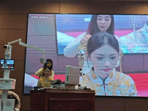 讲座中,陈老师为学生们讲解了近年来新娘跟妆的流行趋势、色彩搭配、妆容技巧、新娘需求沟通等理论知识,也实际操作了当下较为流行的新娘晨袍妆、新中式新娘造型等,细致讲解妆容步骤、实操技能要点及快速换妆方法,为人物形象设计专业学生带来新娘跟妆实操演练的全程再现。