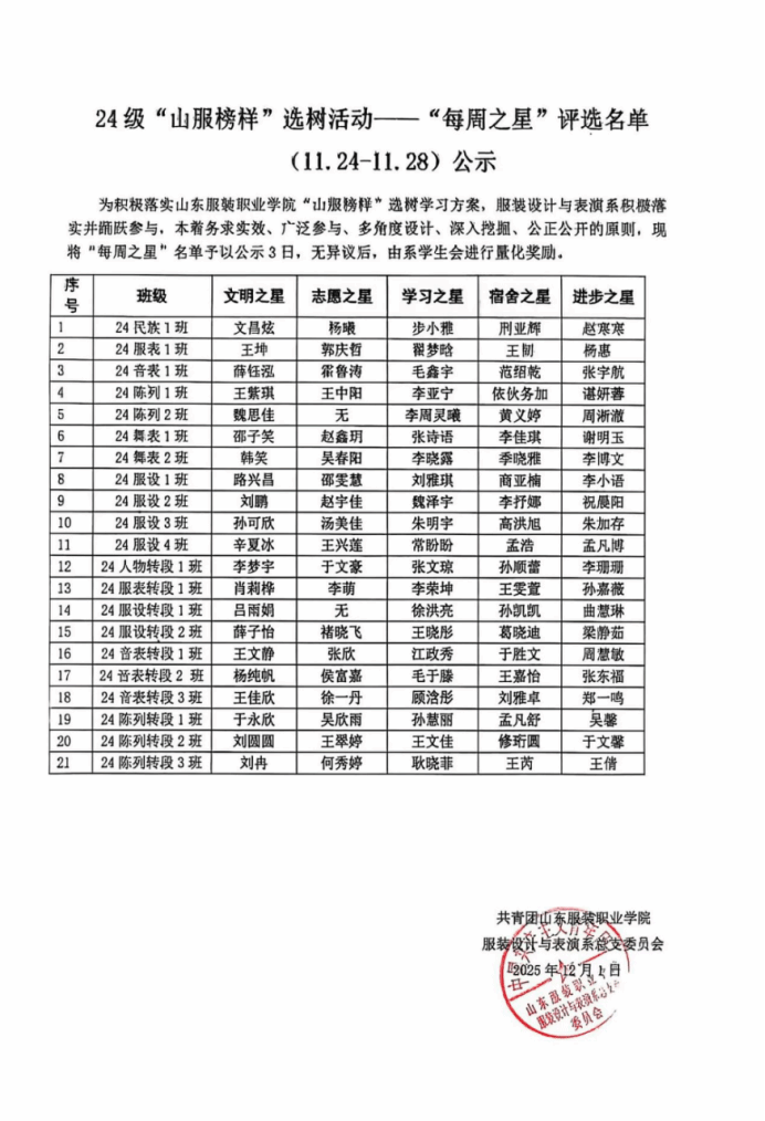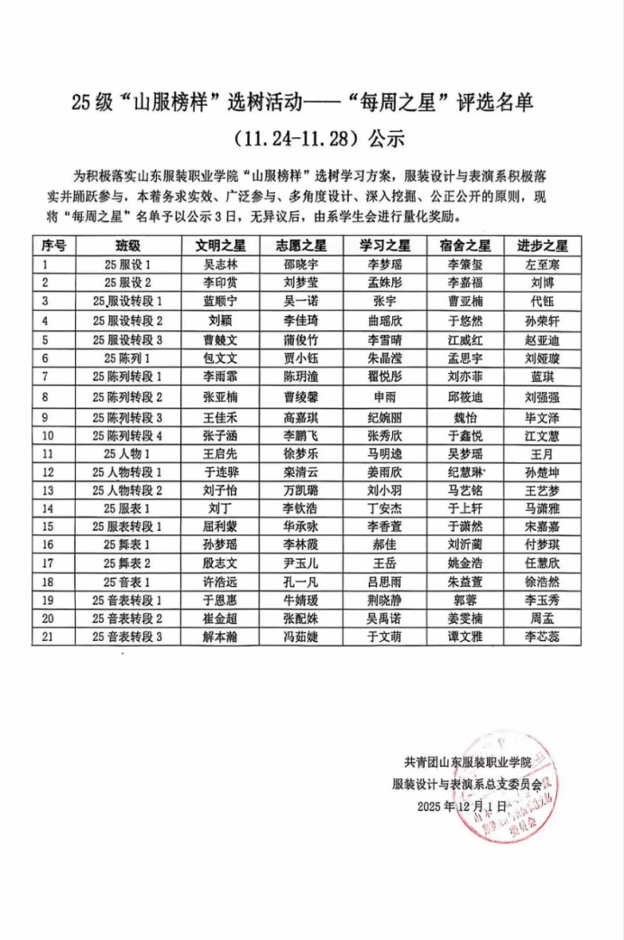 “山服榜样”选树活动——“每周之星”第十三周(11.24-11.28)评选结果