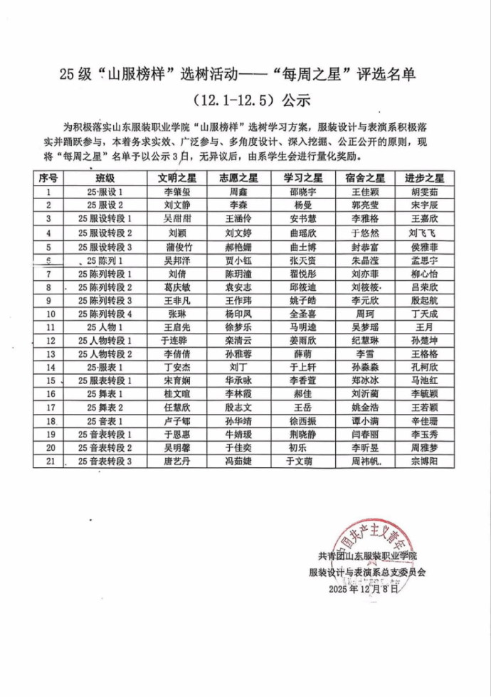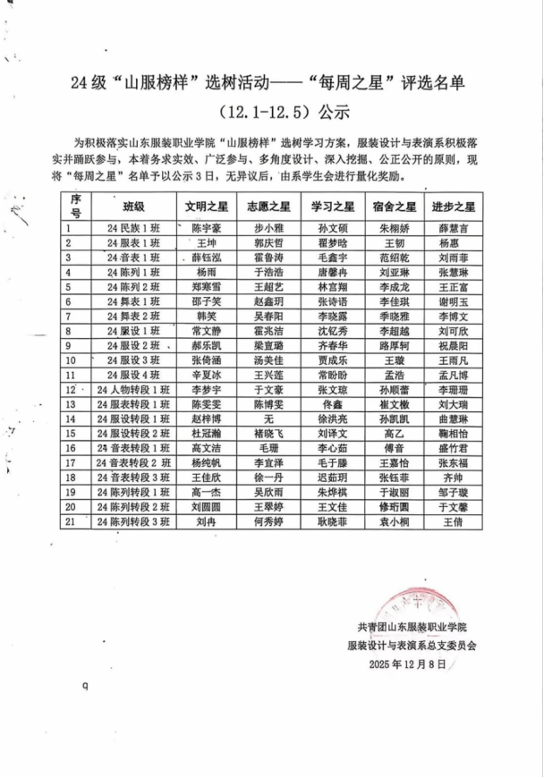 “山服榜样”选树活动——“每周之星”第十四周(12.1-12.5)评选结果