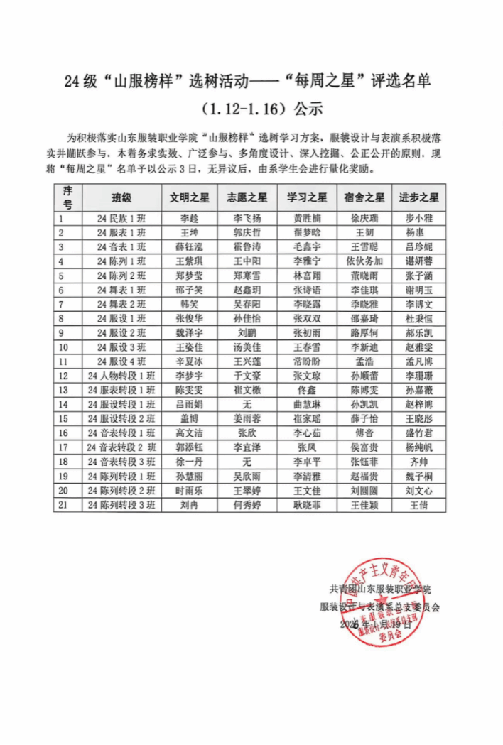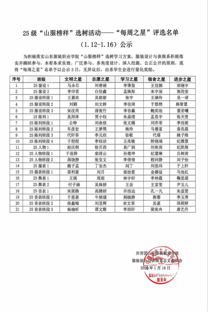 “山服榜样”选树活动——“每周之星”第20周(1.12-1.16)评选结果