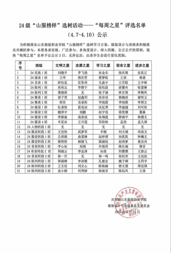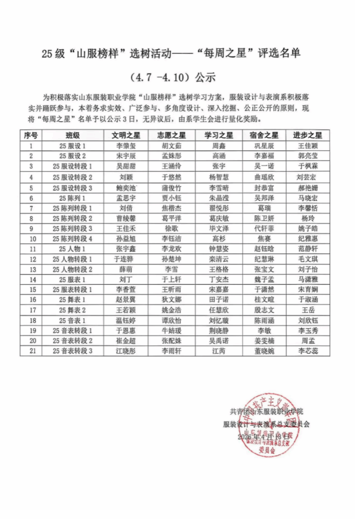 “山服榜样”选树活动——“每周之星”第5周(4.7-4.10)评选结果