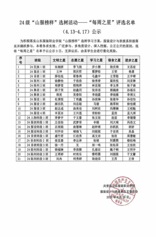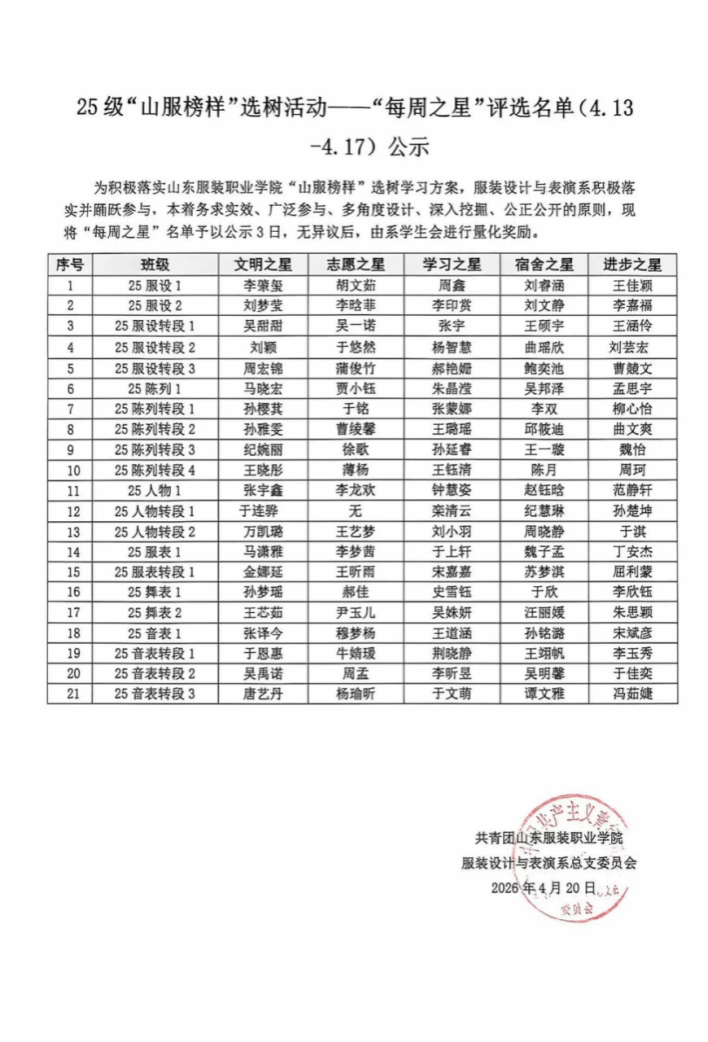 “山服榜样”选树活动——“每周之星”第6周(4.13-4.17)评选结果