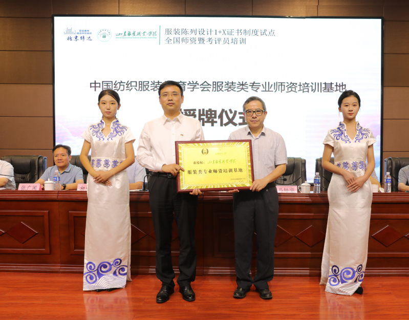 中国纺织服装教育学会常务副会长倪阳生分别向学院授牌“服装陈列设计职业技能等级证书师资培训基地”