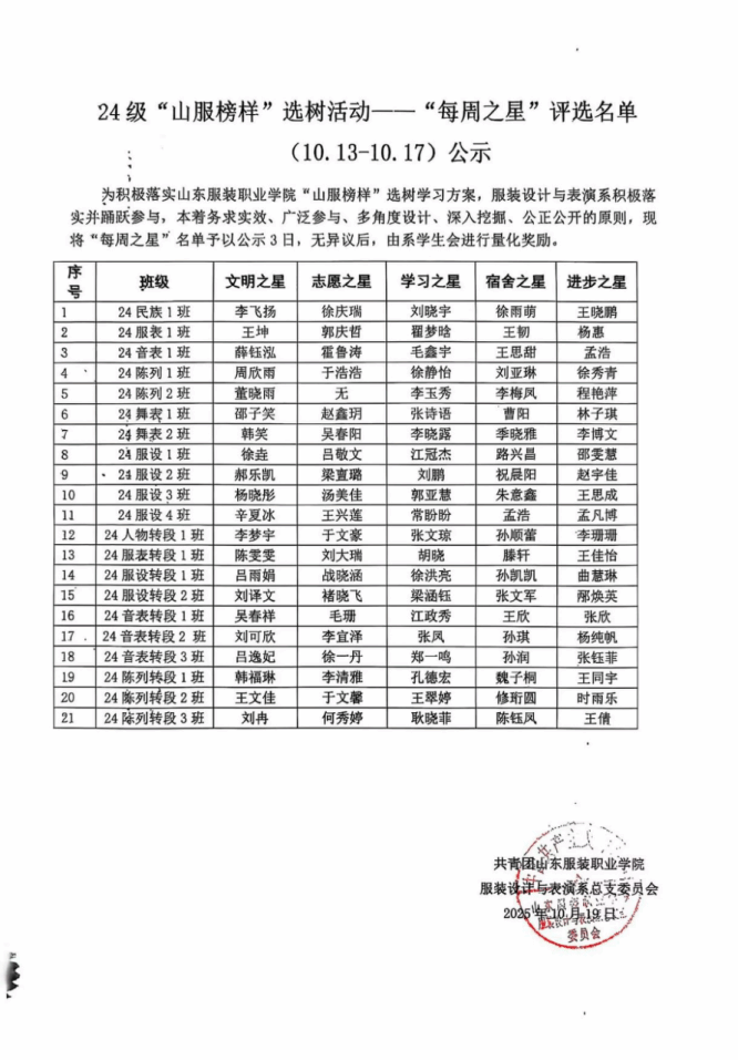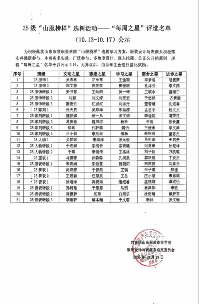 “山服榜样”选树活动——“每周之星”第七周(10.13-10.17)评选结果