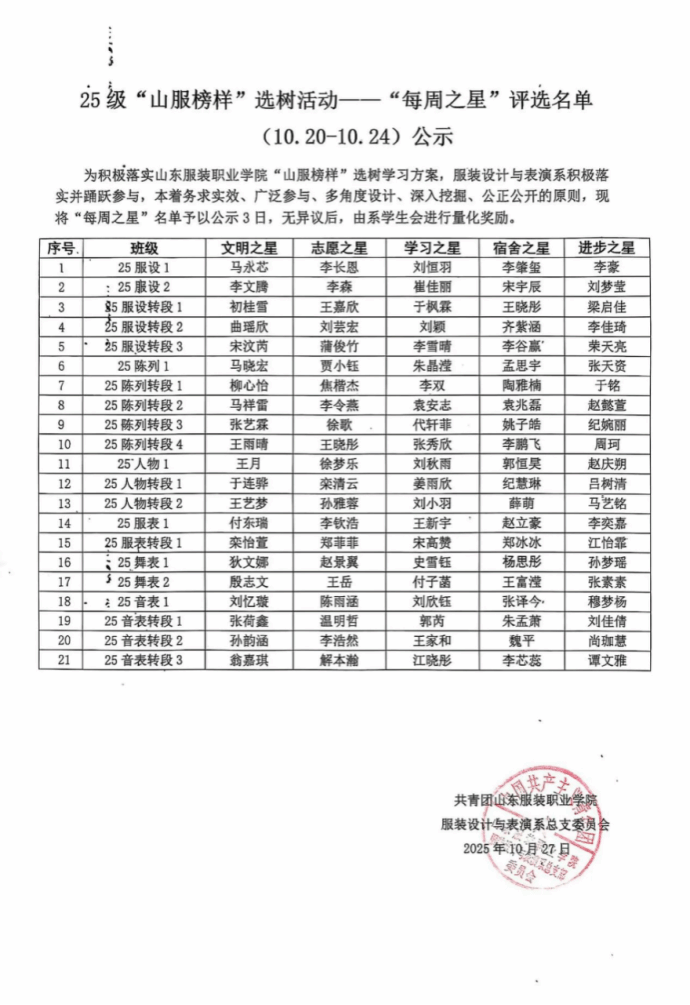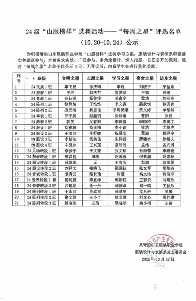 ​ “山服榜样”选树活动——“每周之星”第八周(10.20-10.24)评选结果