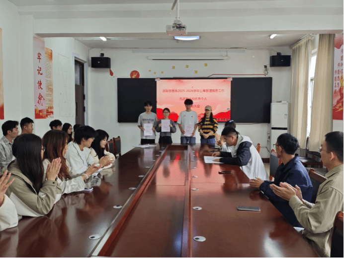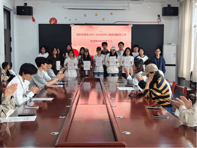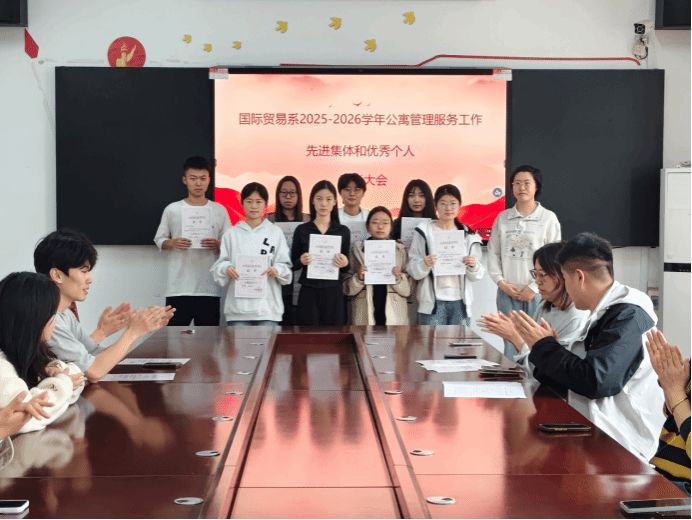 为树立先进典型、夯实学生公寓管理基础,营造文明安全、整洁有序的住宿育人环境,4月22日,国际贸易系召开2025-2026学年公寓管理服务工作先进集体、优秀个人表彰大会,系全体辅导员及各班学生代表参会。