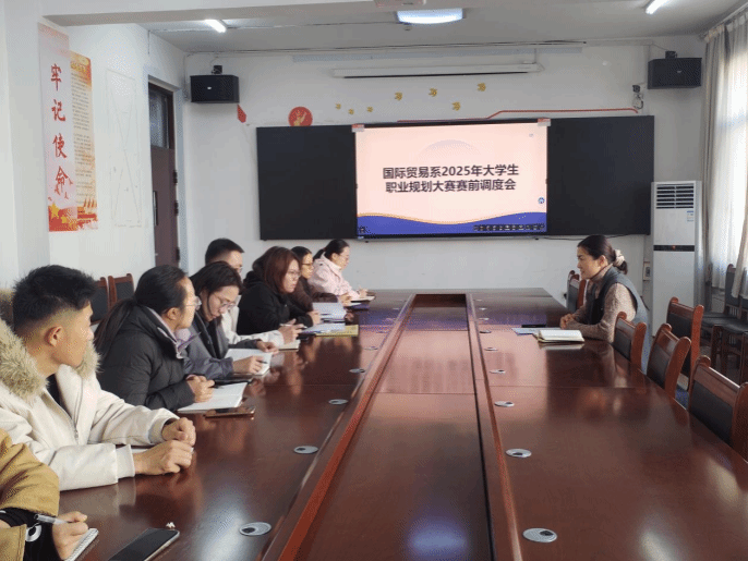 为积极备战2025年第三届全国大学生职业规划大赛,全面提升参赛作品质量与竞赛水平,11月25日,国际贸易系举行赛前调度会。系党总支副书记王蕴玉主持,指导老师及相关工作负责人参加。