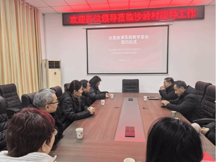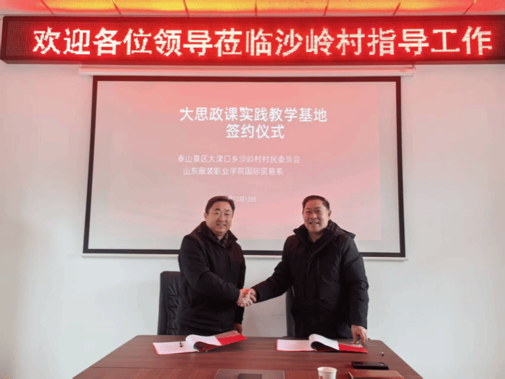 为深入贯彻落实习近平总书记关于“大思政课”的重要指示批示精神,扎实推进立德树人根本任务,推动思政教育“小课堂”与社会“大课堂”深度融合,12月12日,山东服装职业学院国际贸易系与泰安市泰山景区大津口乡沙岭村“大思政课”实践教学基地结对签约仪式在沙岭村举行。国际贸易系主任石吉勇、党总支副书记王蕴玉,沙岭村党支部书记、村委会主任禹敦有及双方相关负责人出席仪式。