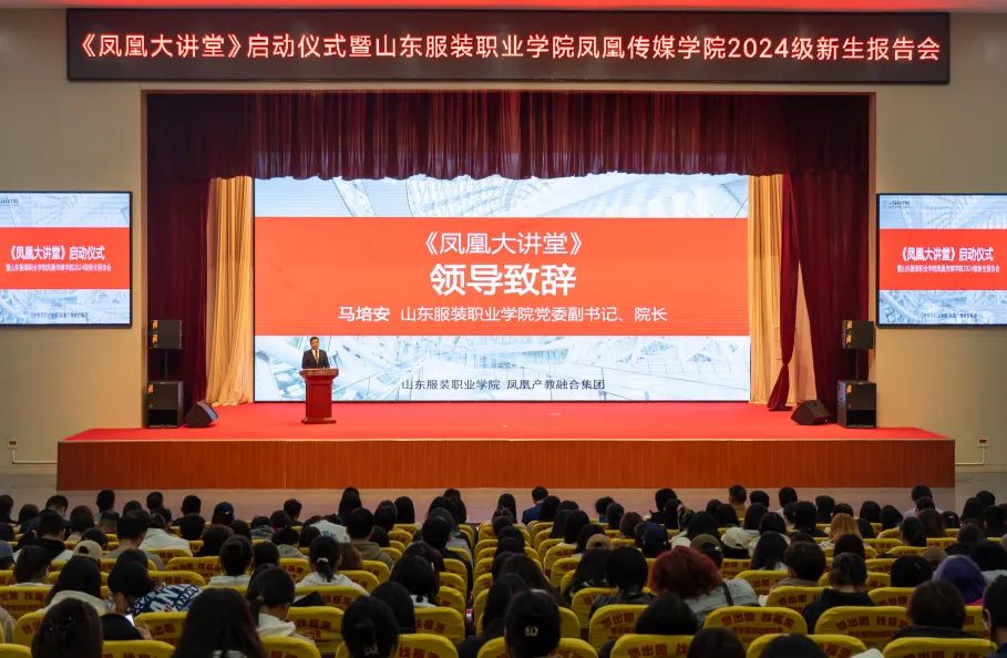 10月29日,“凤凰大讲堂”启动仪式暨山东服装职业学院凤凰传媒学院2024级新生报告会在学院艺术剧院举行。凤凰产教融合集团总裁刘江波、山东服装职业学院党委书记郝燕出席仪式并为“凤凰大讲堂”揭牌。山东服装职业学院党委副书记、院长马培安致辞。启动仪式由学院党委委员、副院长殷广胜主持。