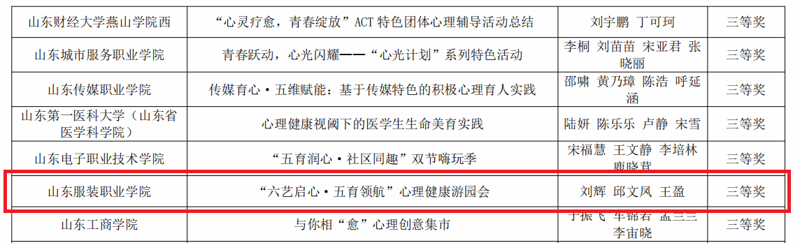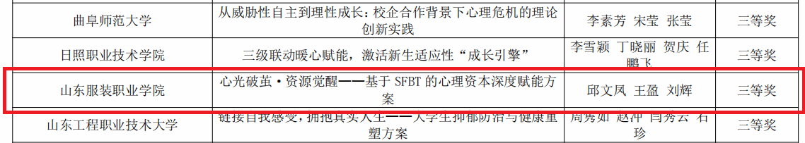近日,2025年山东省高校心理健康教育月展示活动评选结果公布,山东服装职业学院师生表现优异,在所有赛项均有收获,荣获二等奖2项、三等奖3项,共获5个奖项,充分彰显了学院心理育人工作在体系化建设与专业化实践中的显著成效。