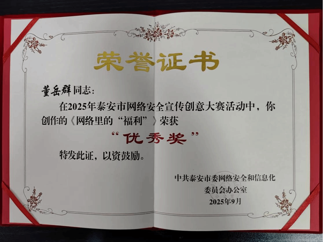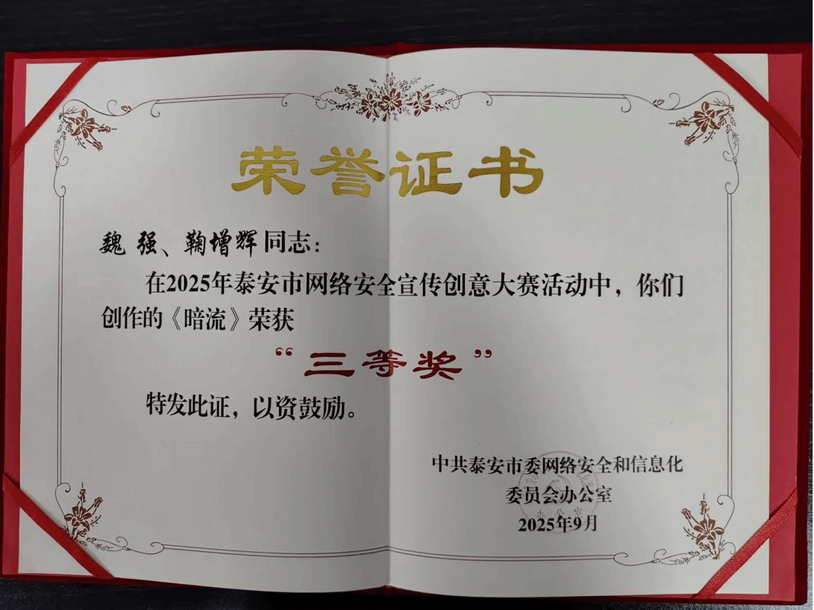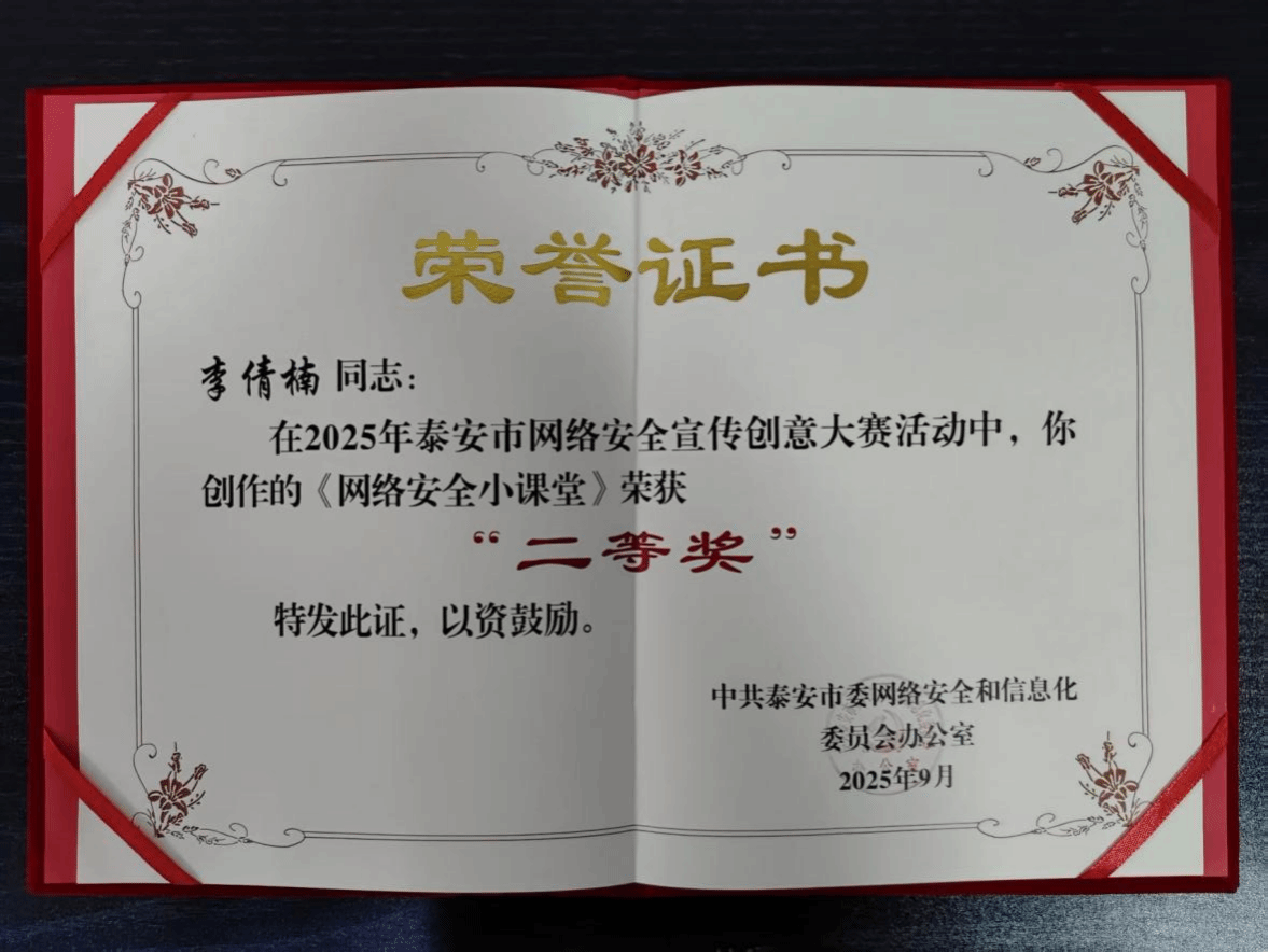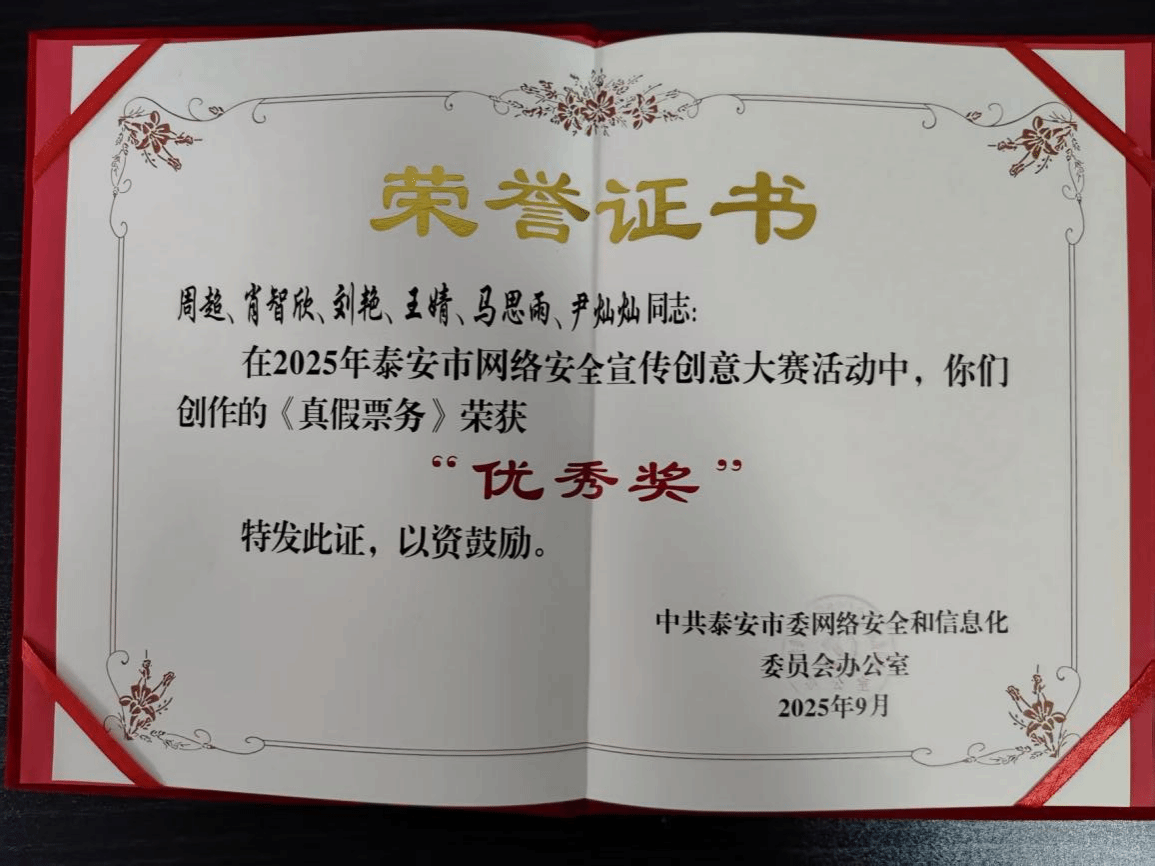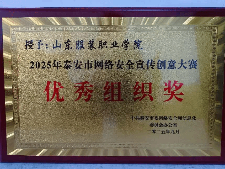 近日,2025年泰安市网络安全宣传创意大赛落下帷幕,山东服装职业学院师生在此次大赛中表现出色,获二等奖1项、三等奖1项、优秀奖2项,学院获“优秀组织奖”。