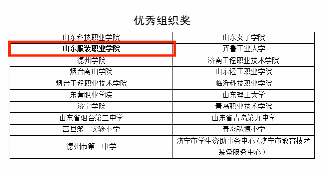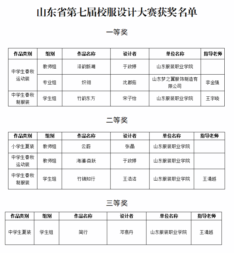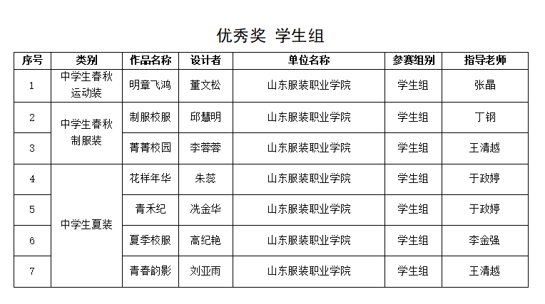 近日,由山东省教育厅、山东省工业和信息化厅、山东省市场监督管理局联合主办的山东省第七届校服设计大赛落下帷幕,山东服装职业学院荣获优秀组织奖。学院服装设计与表演系师生凭借扎实的专业功底和创新设计理念,经过初评、成衣报送、终评三个阶段的比拼,从全省参赛队伍中脱颖而出,教师组获一等奖1项、二等奖2项,学生组获一等奖1项、二等奖1项、三等奖1项、优秀奖7项,指导专业组获一等奖1项,充分展现了学院在服装专业人才培养与实践教学领域的突出成果。