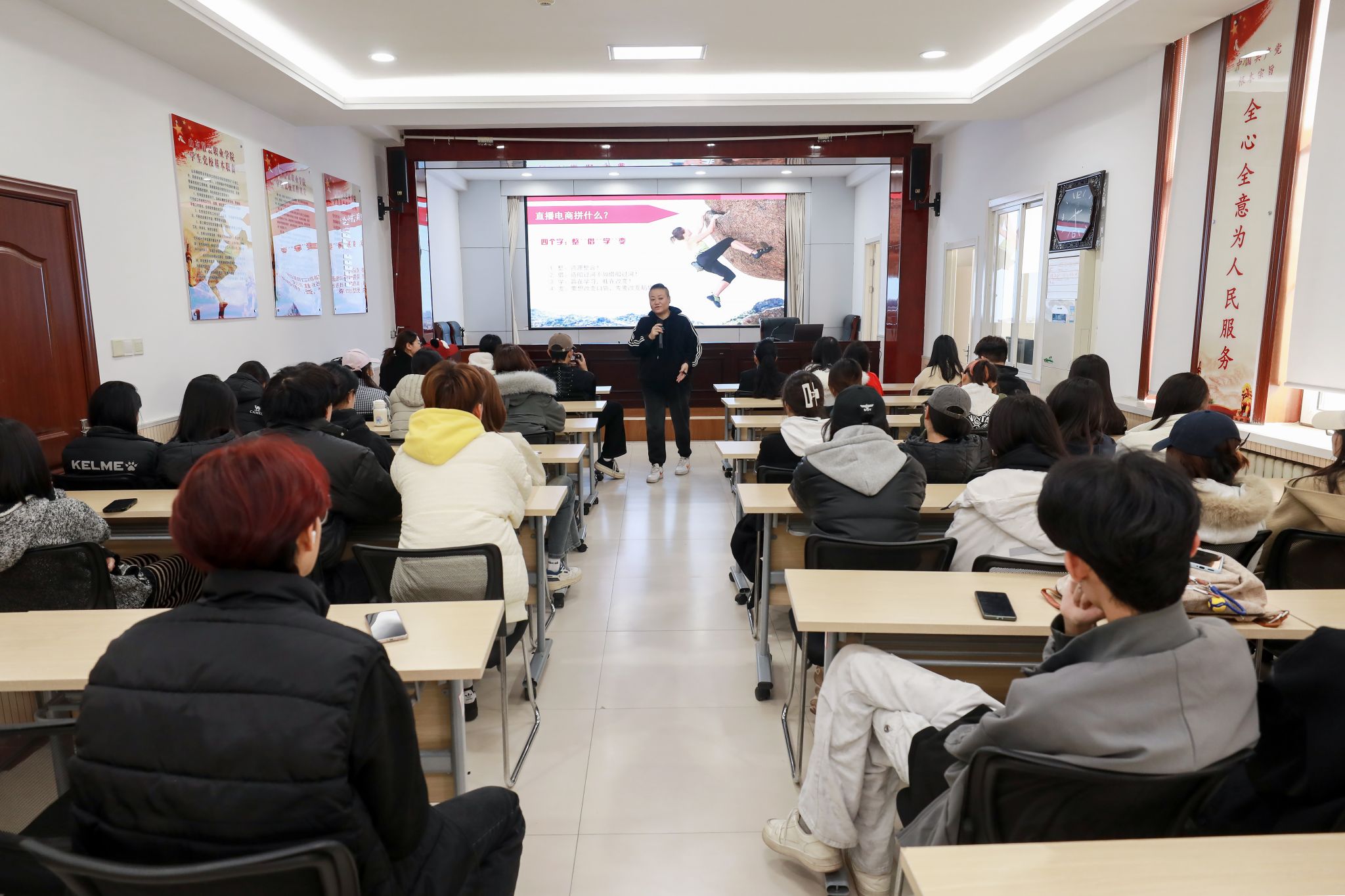 中国电子商会跨境电商工作委员会委员、中国服装设计师协会陈列委员会委员蒙辉为师生带来了一场主题为“如何高效切入直播电商”的精彩讲座。
