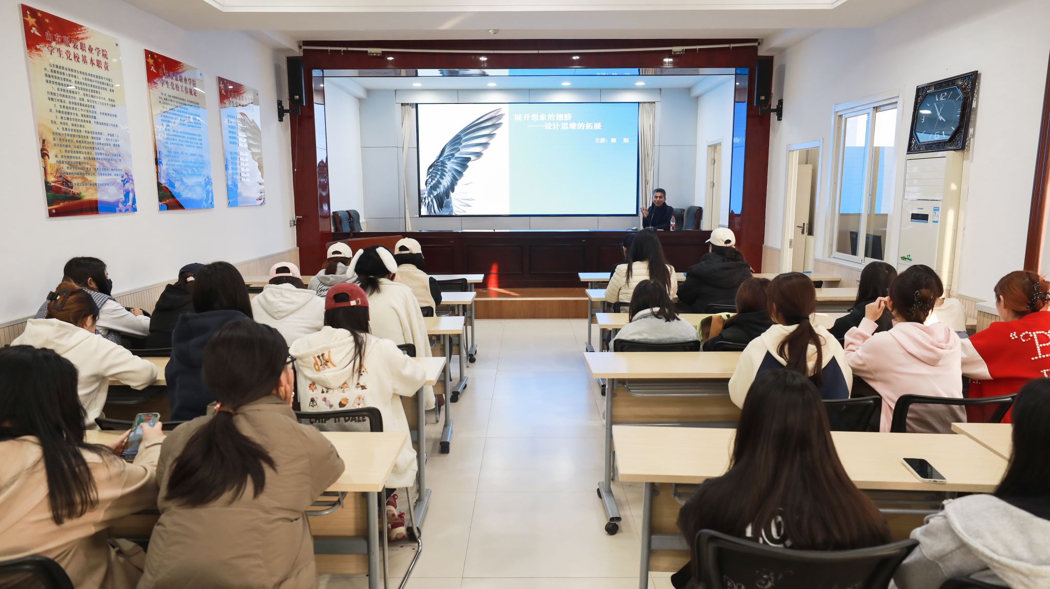 韩阳以“不一样的翅膀”为喻,强调优秀设计师既需拥有“飞翔的翅膀”敢于想象,也要具备“起落架”脚踏实地。他通过“在白纸上画横线”“鱼能在天上飞吗”等互动练习,引导同学们打破思维定式;以知名品牌动态橱窗和装置艺术陈列为例,阐释了如何通过机械装置、光影变化等手法,将静态展示升华为沉浸式体验,实现艺术与商业的融合。