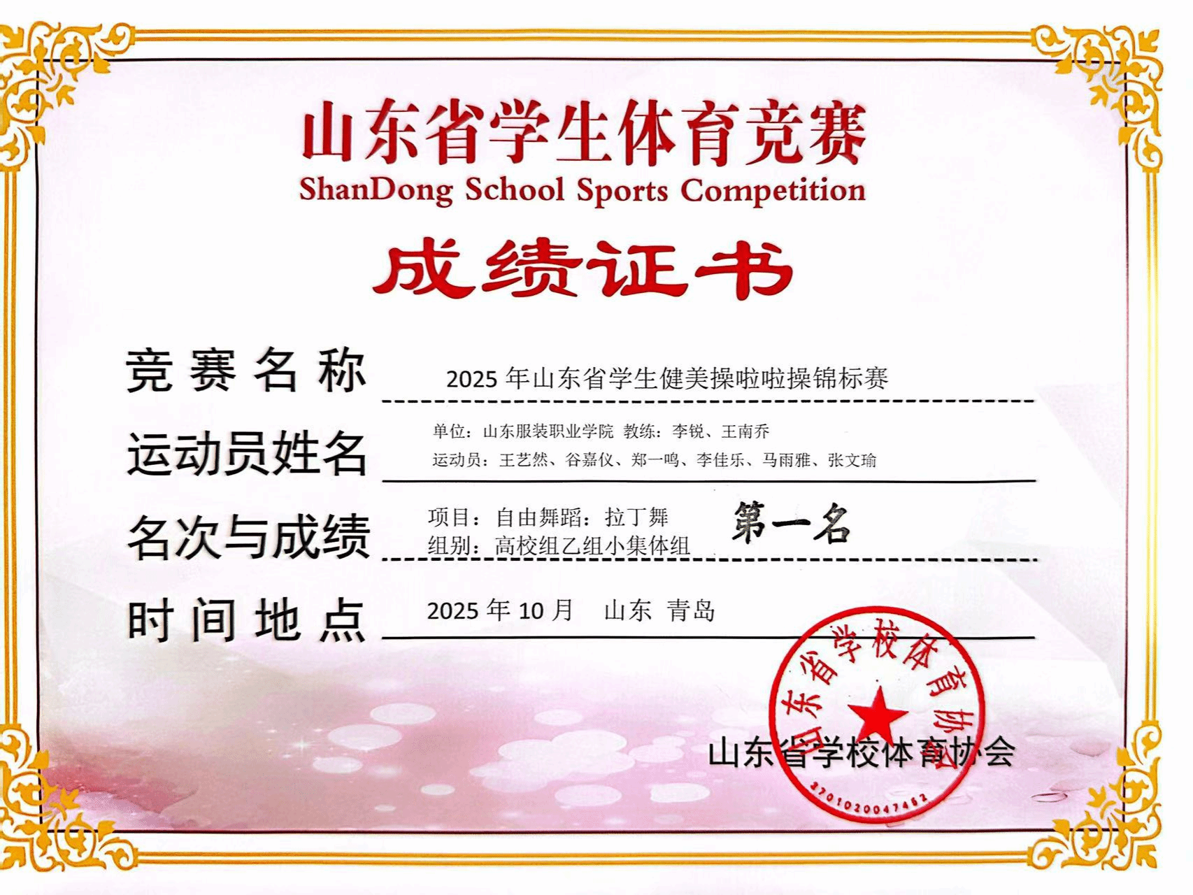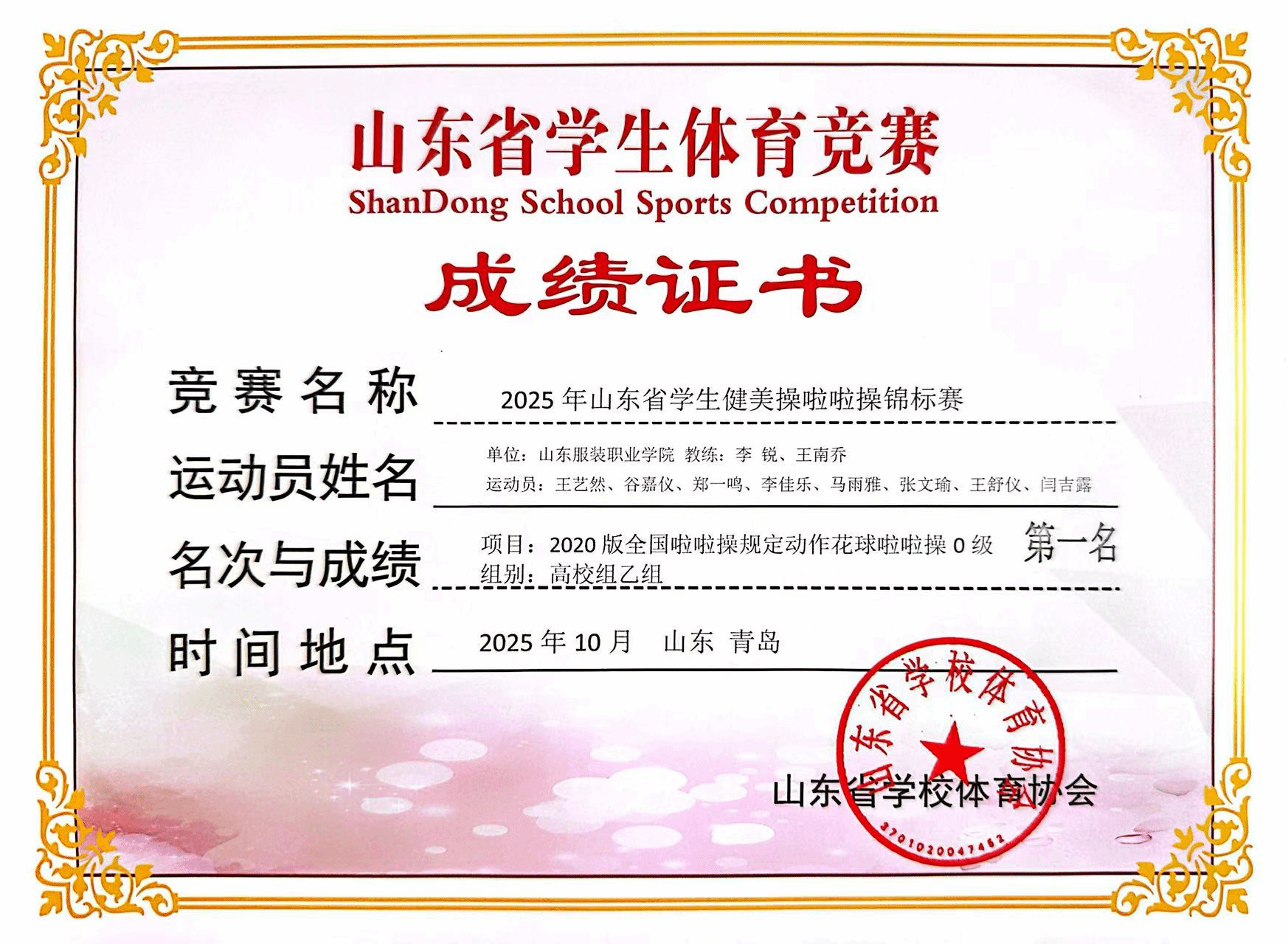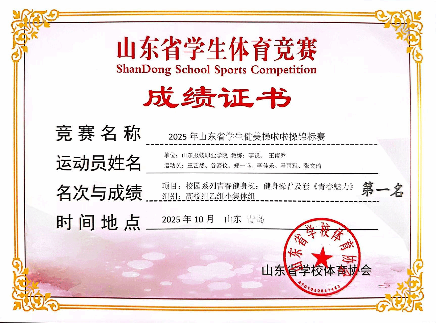 激情与活力共舞,拼搏与荣耀齐飞。10月24日至26日,2025年山东省学生健美操、啦啦操锦标赛在青岛举行,山东服装职业学院竞技队8名健儿凭借出色的发挥和极具感染力的表现,从30余支参赛队伍中脱颖而出,荣获高校乙组健身操、健身操舞、花球啦啦操三个项目的冠军。