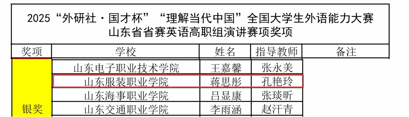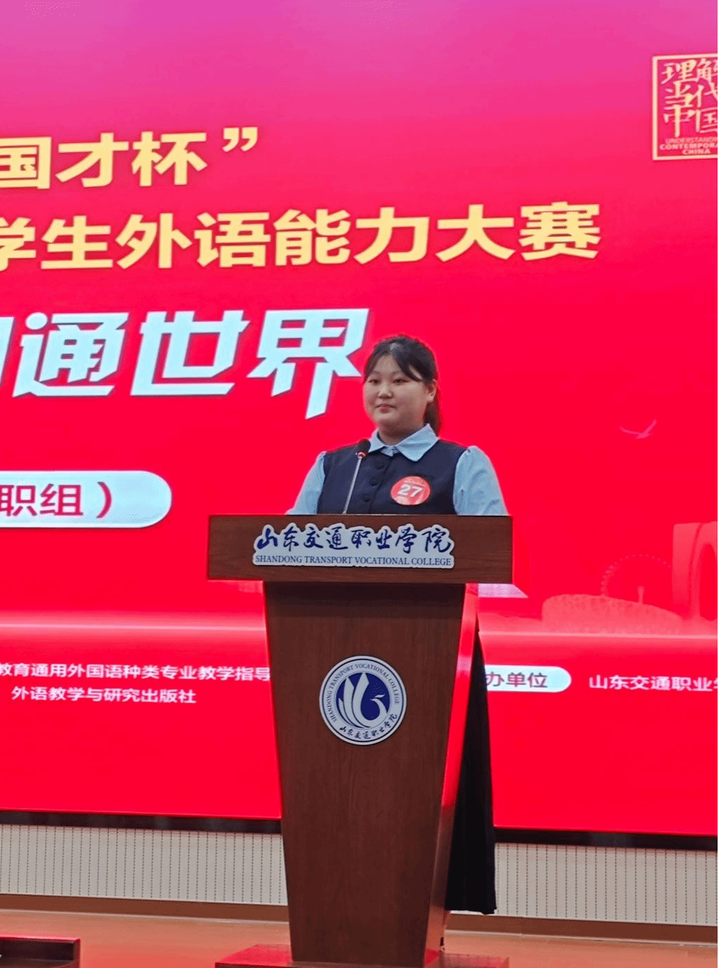 11月1日,2025“外研社·国才杯”“理解当代中国”全国大学生外语能力大赛山东省赛区(高职组)演讲大赛决赛在山东交通职业学院举办。学院2024级服装与服饰设计专业学生蒋思彤凭借出色的语言表达能力和稳定的现场发挥,荣获银奖,指导教师为孔艳玲。