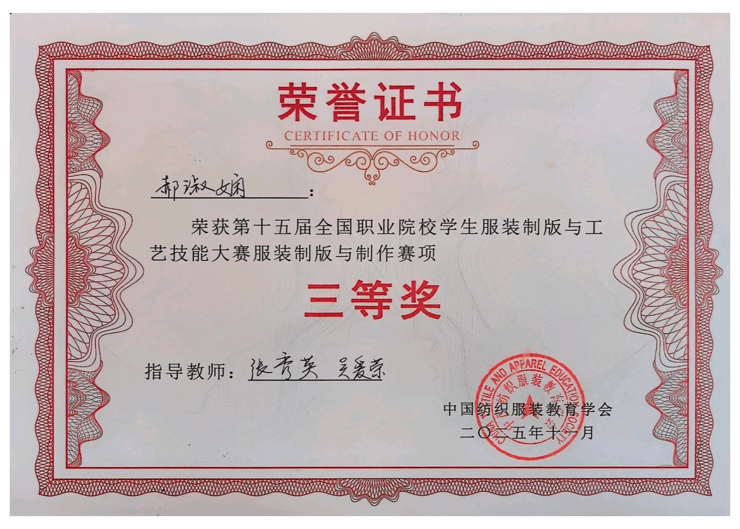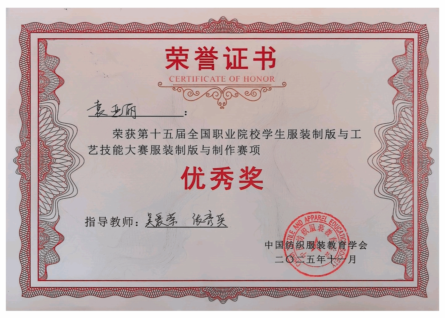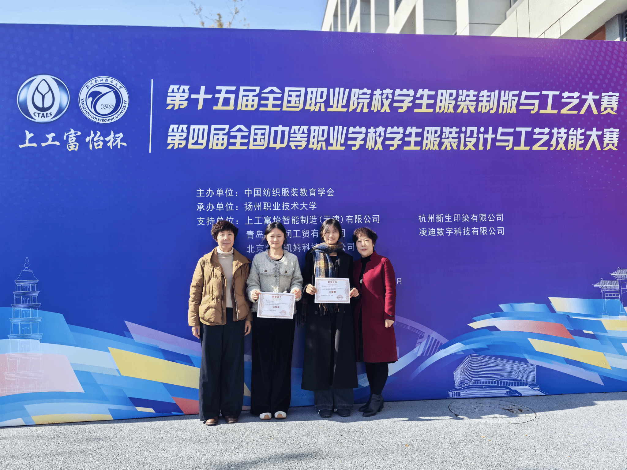 11月17日,由中国纺织服装教育学会主办的“上工富怡杯”第十五届全国职业院校学生服装制版与工艺技能大赛落幕。学院学子在制版与制作赛项中表现突出,2025级服装设计与工艺2班郝淑娴荣获三等奖,2024级服装设计与工艺5班袁亚丽获得优秀奖。