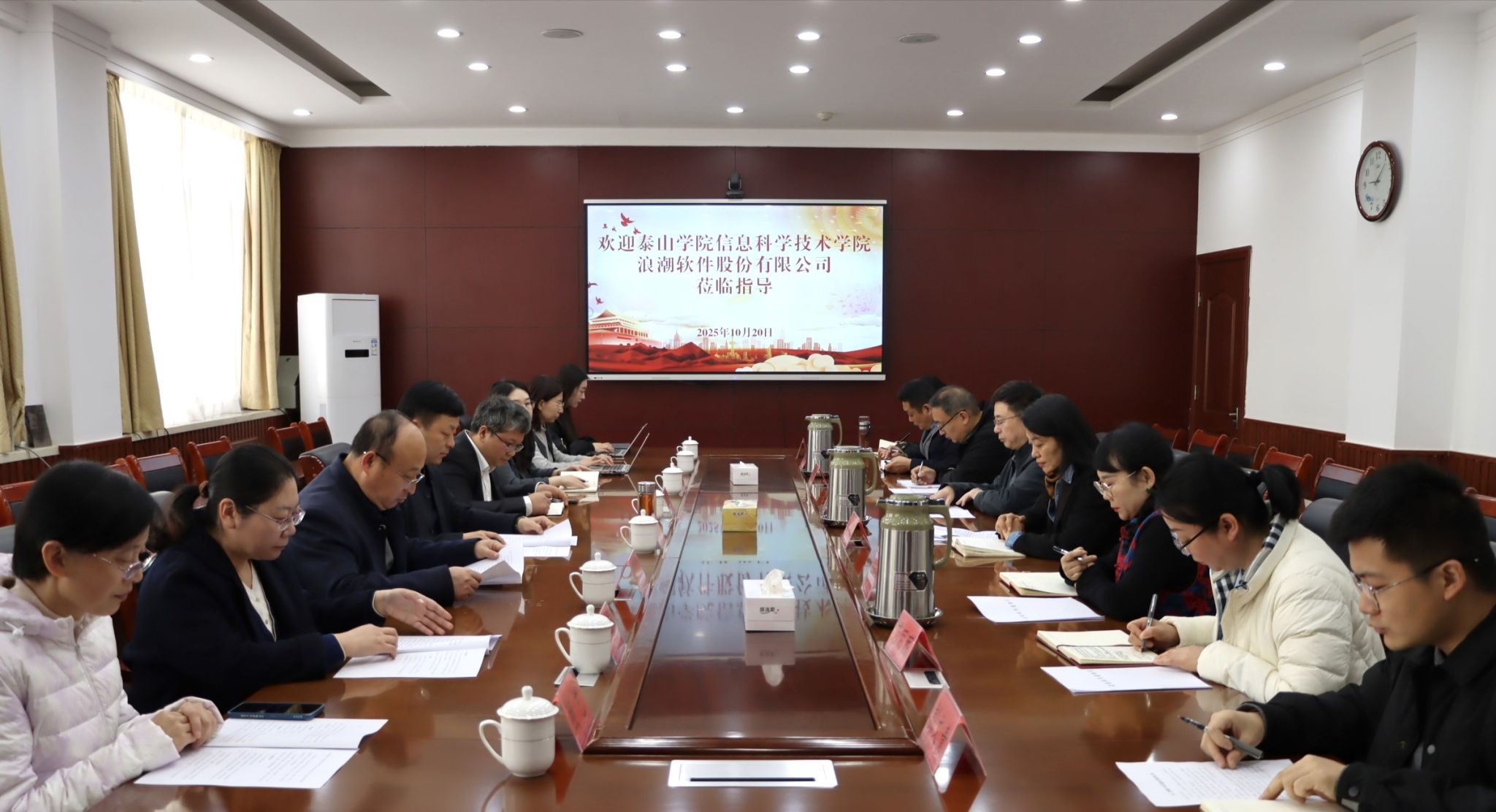 联合教研座谈会由信息工程系党总支书记主持。座谈会上,三方围绕“专本贯通”人才培养中的课程衔接、教学资源共享、实践能力贯通等方面进行了深入交流。浪潮软件股份有限公司代表介绍了“浪潮实训中心”建设方案,为后续校企共建实训平台奠定了坚实基础。信息工程系与泰山学院信息科学技术学院以“党建引领同向同行,专本贯通协同育人”为主题,分别介绍了各自党组织的建设情况与特色工作,并就党组织共建协议内容及后续联合党建活动规划进行了讨论。随后,三方就“浪潮实训中心”建设方案进行深入磋商,力求推动项目落地,共同打造高水平产教融合实践平台。