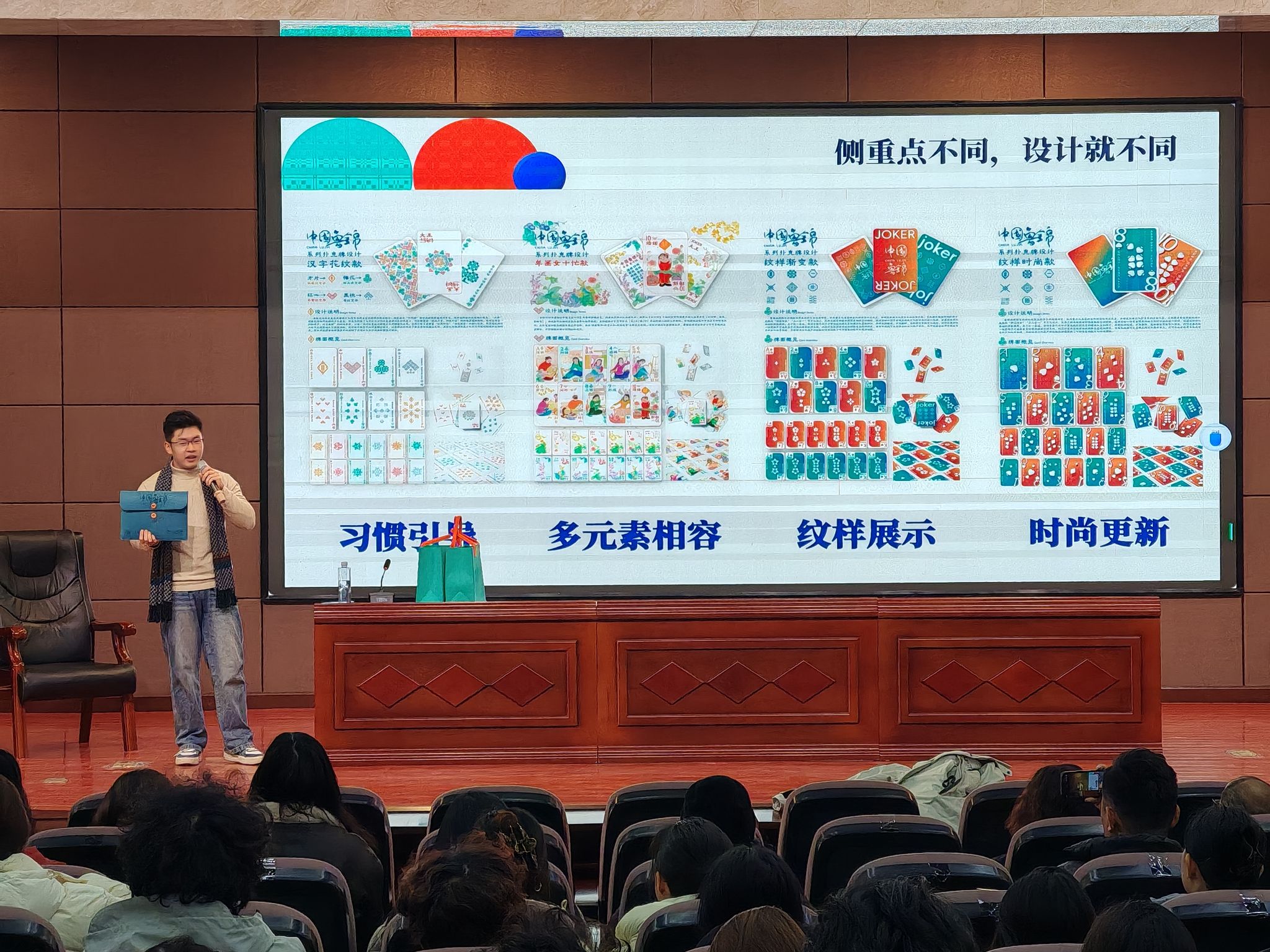 讲座中,王大海教授以“研、学、产、创”四维一体为脉络,系统解读鲁锦的文化基因与当代价值,结合多款鲁锦创新设计案例提出创作思路,现场展示随行的研究生团队研发的鲁锦扑克文创产品,实现“实用+科普”双重价值。