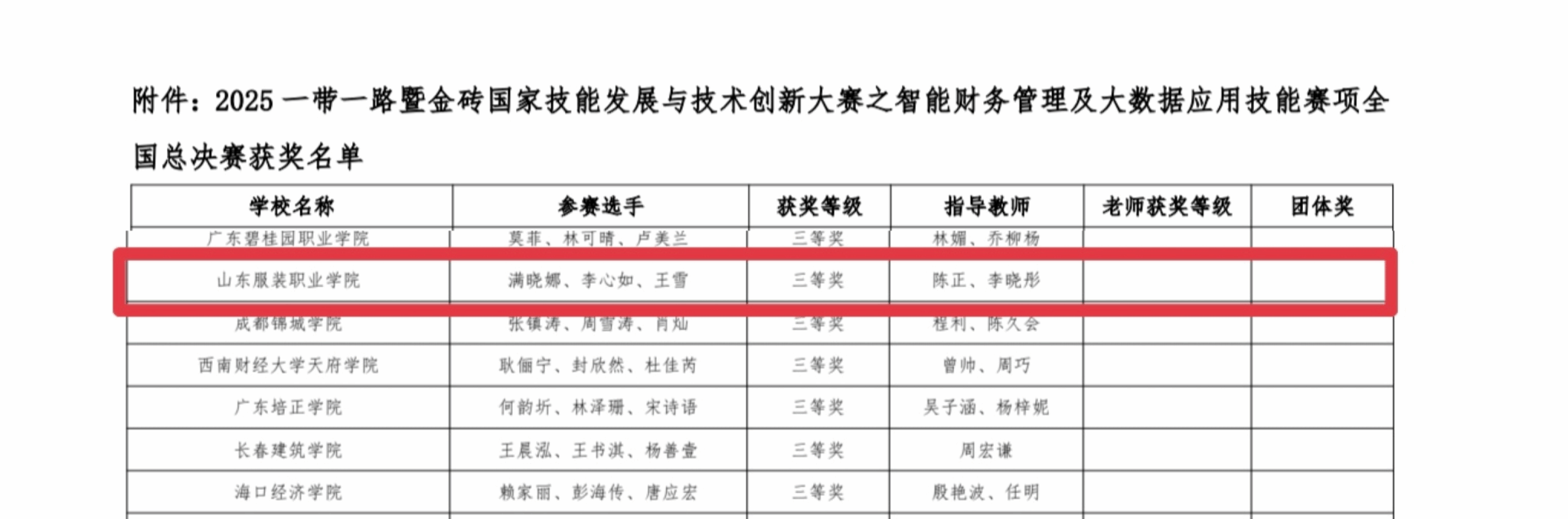 11月30日,2025一带一路暨金砖国家技能发展与技术创新大赛“智能财务管理及大数据应用技能”赛项全国总决赛在安徽落下帷幕。财经系学生王雪、李心如、满晓娜组成的代表队在陈正、李晓彤两位老师的悉心指导下荣获三等奖。