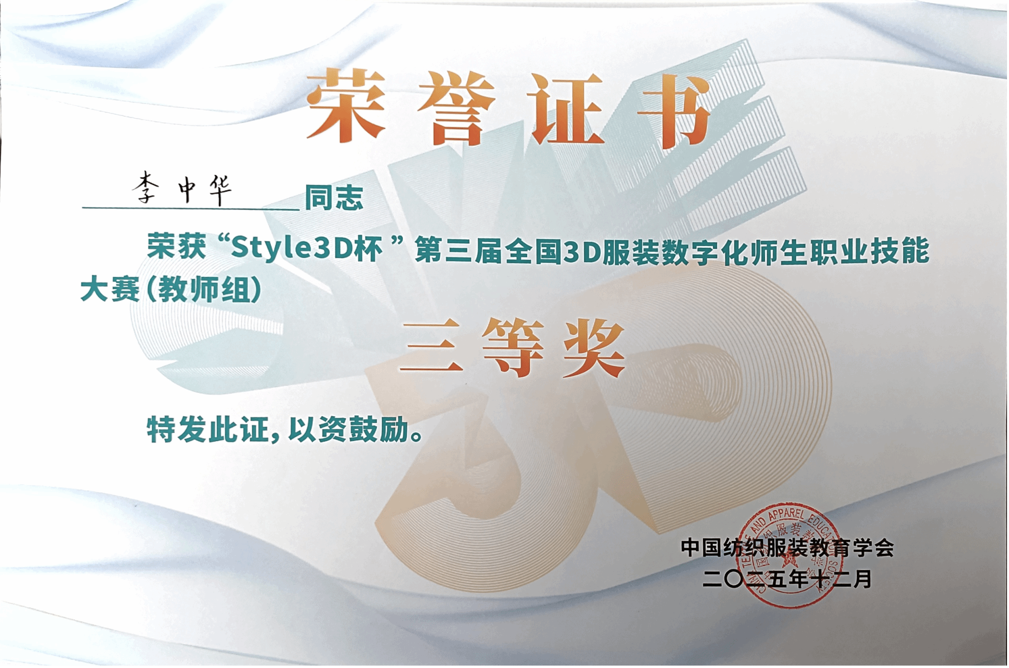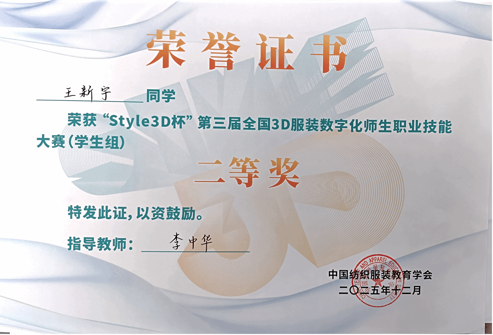 在李中华的悉心指导下,服装工程与管理系学生王新宇在学生组竞赛中表现亮眼,凭借对3D服装建模、虚拟试衣等技术的精准运用,从预赛到决赛稳步进阶,荣获学生组二等奖。