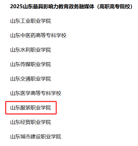 近日,山东省互联网传媒集团发布2025年度山东高校系列榜单,山东服装职业学院荣获2025年度“山东最佳品牌影响力高校”“山东最具影响力教育政务融媒体”两项称号。