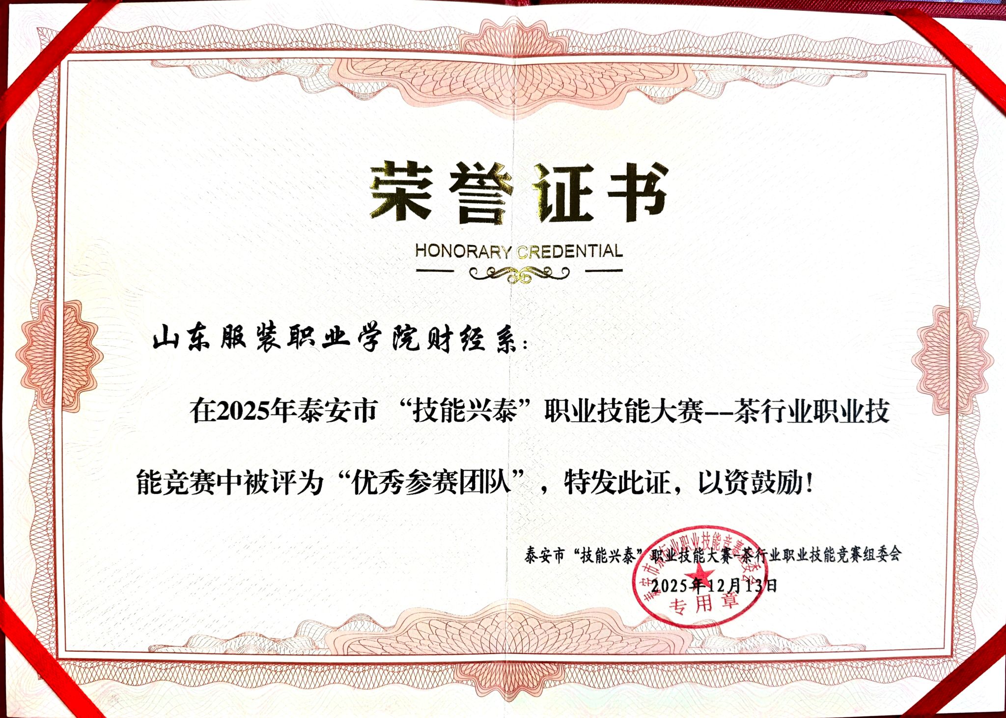 近日,2025年泰安市“技能兴泰”职业技能大赛——茶行业职业技能大赛颁奖典礼暨职业技能等级证书发放仪式举行。财经系教师梁一乔、郝天齐晋升为二级技师,并获“优秀参赛选手”荣誉;6位参赛选手获得三级职业技能等级证书;财经系参赛团队获评“优秀参赛团队”。