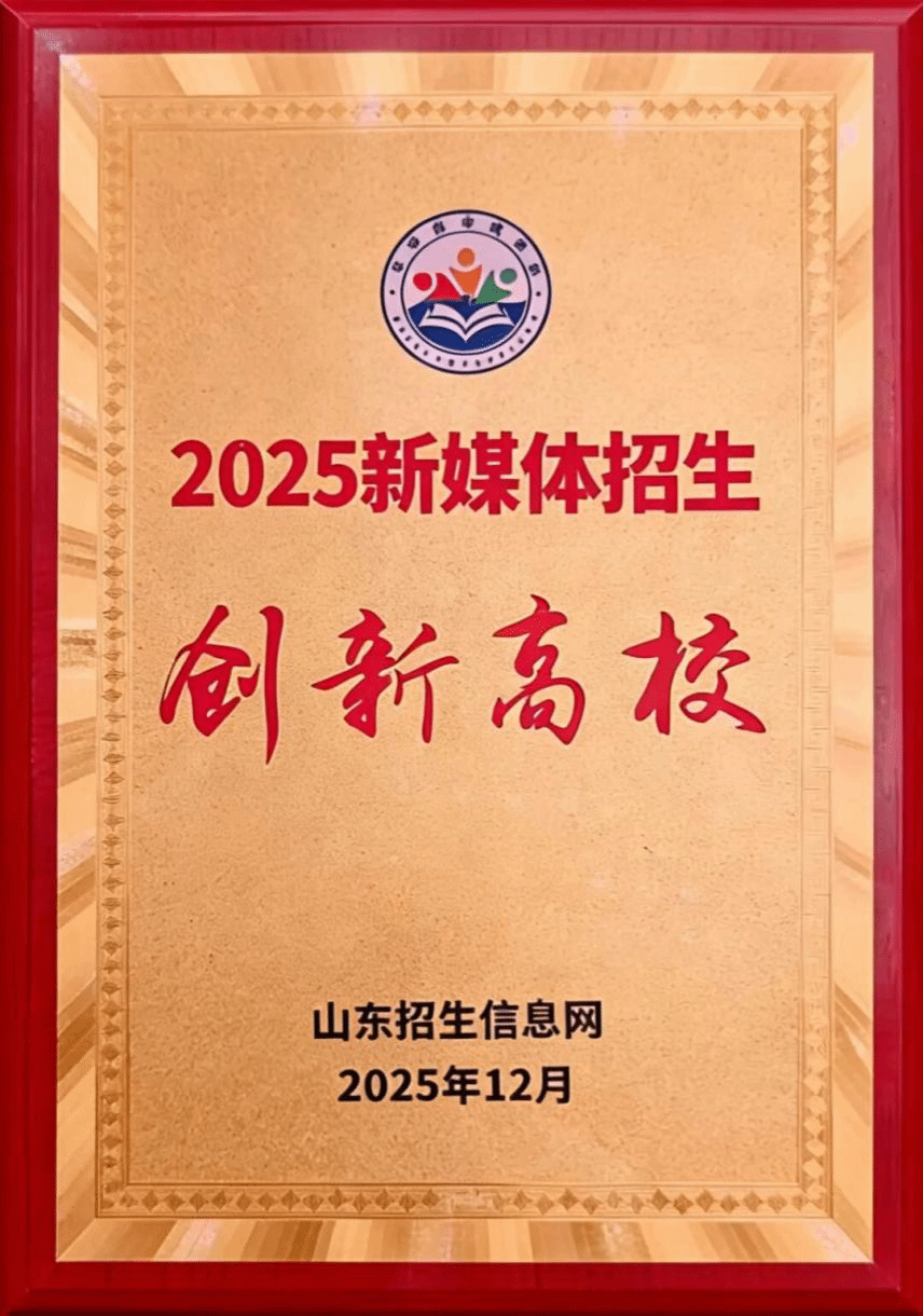 “2025新媒体招生创新高校”称号由山东招生信息网授予,该荣誉充分肯定了学院在招生宣传领域的创新理念与实践成果。