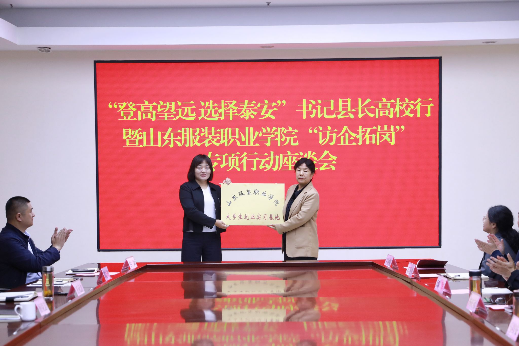 学院党委委员、副院长刘光珍向东平县纺织服装产业园授予“山东服装职业学院就业实习基地”牌匾。