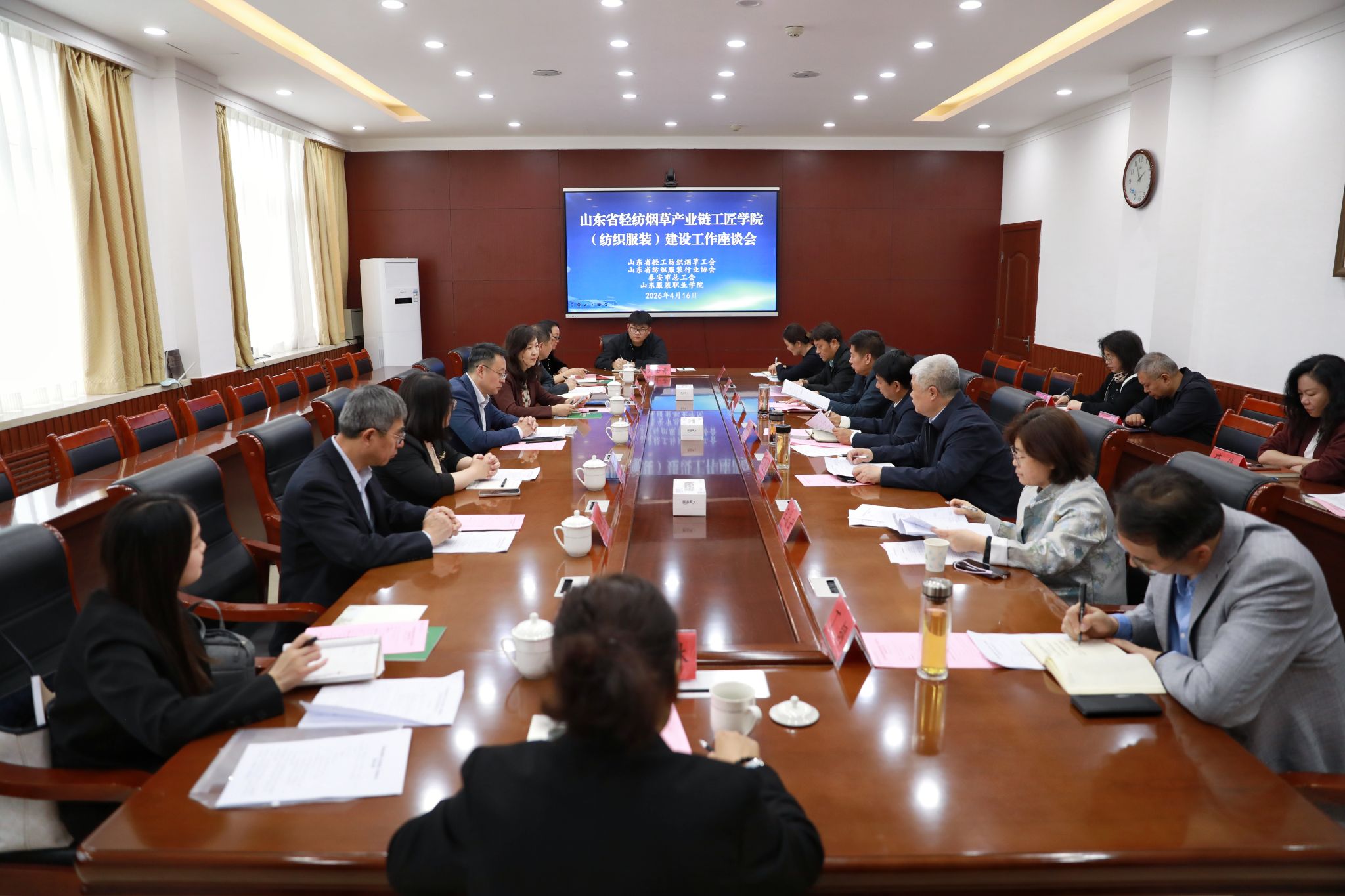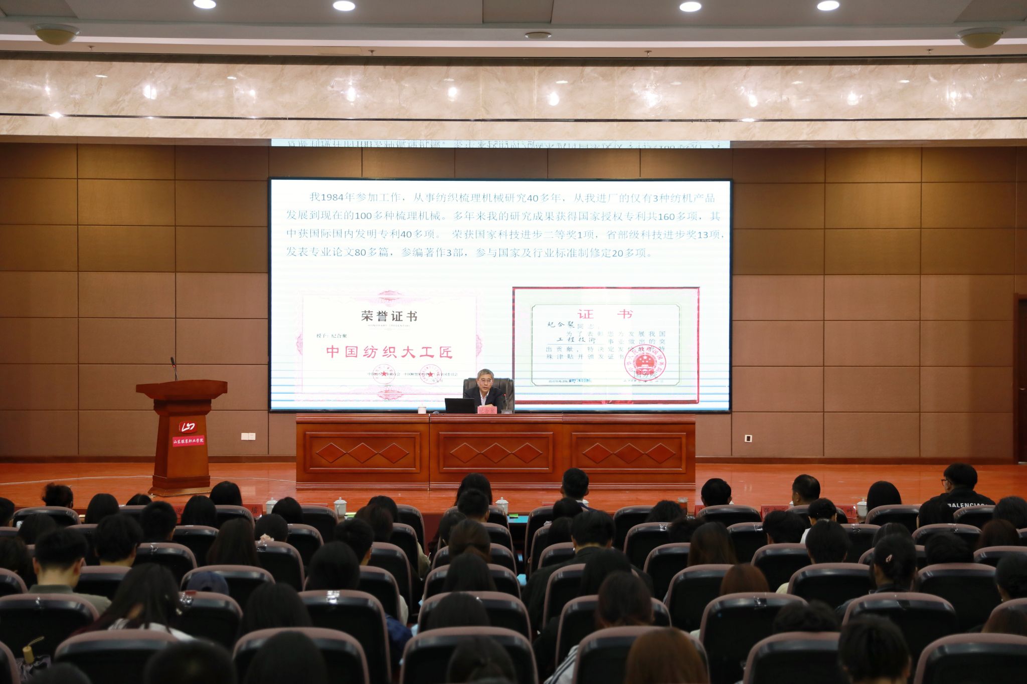 4月16日,山东省轻纺烟草产业链工匠学院(纺织服装)建设工作座谈会暨山东省轻纺烟草系统劳模工匠宣讲活动在学院举办。全国纺织工业劳动模范、中国纺织大工匠、青岛东佳纺机集团有限公司总工程师纪合聚,泰安市劳动模范、山东省轻工纺织行业“齐鲁工匠”、山东服装职业学院客座教授牛玉叶两位行业顶尖劳模工匠参会并作宣讲。