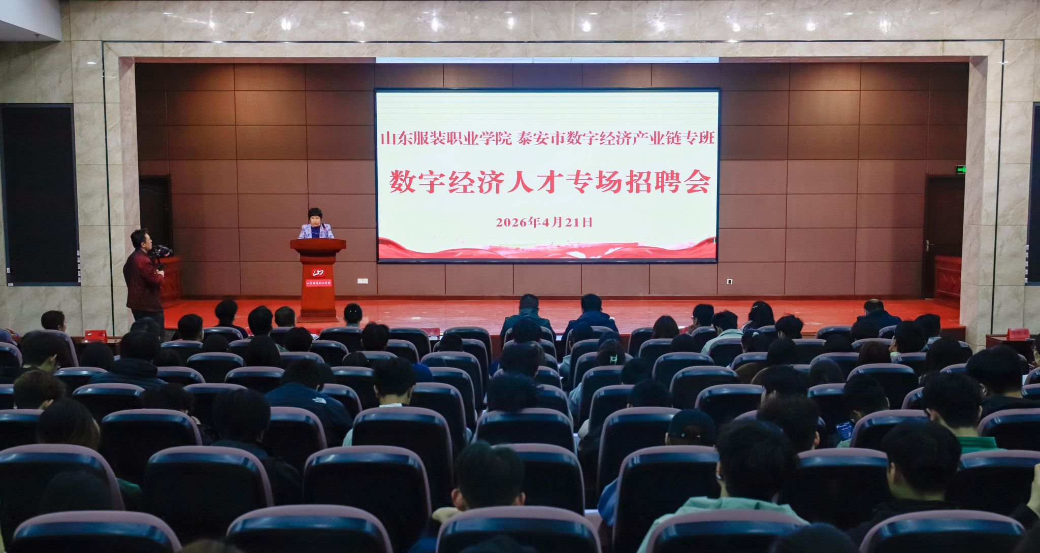 为深化政校企合作,精准对接人才供需,助力毕业生高质量就业,4月21日下午,山东服装职业学院联合泰安市数字经济产业链专班,在学院旅游实训报告厅举办数字经济人才专场招聘会。泰安市新型工业化强市建设推进委员会办公室产业政策组副组长赵峰、泰安市数字经济产业链专班日常工作负责人李学珍,学院党委委员、副院长刘光珍出席活动;7家数字经济领域优质企业代表,学院招生与就业指导办公室负责同志、各系就业工作负责人及300余名毕业生、实习生代表参加本次活动。