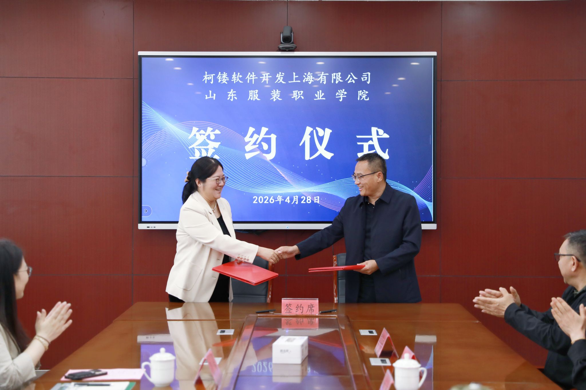 4月28日上午,山东服装职业学院与柯镂软件开发上海有限公司校企合作签约仪式举行。学院党委委员、副院长陈健,党委委员、党委(院长)办公室主任杨庆福出席,教务处、服装设计与表演系、对外合作处负责同志及企业代表等参加活动。