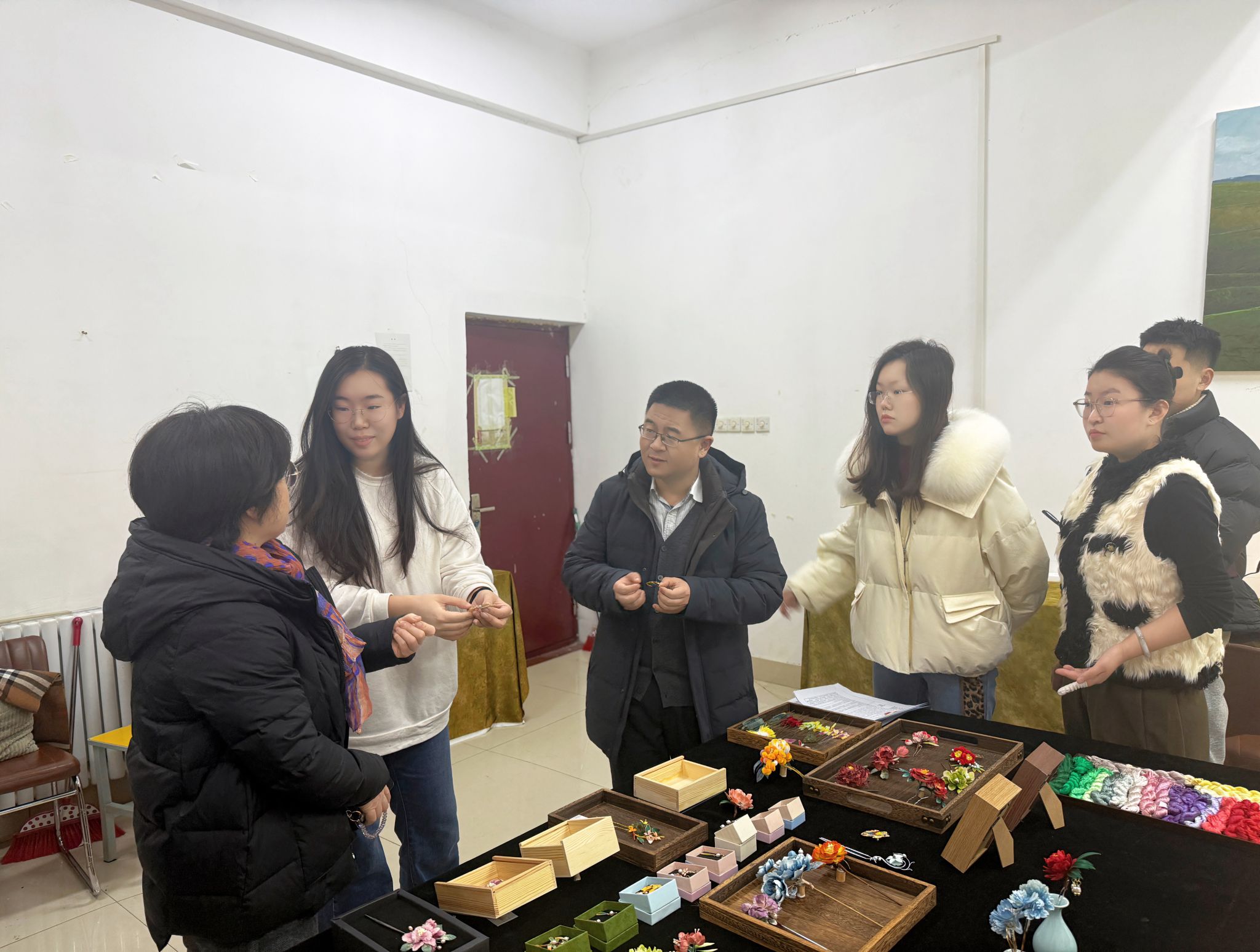 “有凤来仪”非遗工坊负责老师刘凤仪详细介绍了非遗绒花技艺的工艺制作流程、技艺特点及传承创新情况,并展示了工坊近年来创作的各类非遗手造作品,包括传统绒花、绒花与掐丝工艺融合的创新作品、融合泰山文化元素的文创绒花饰品及掐丝珐琅工艺品。这些作品制作工艺精湛,体现了传统文化与现代审美、地方特色的有机结合,受到考察组的一致好评。