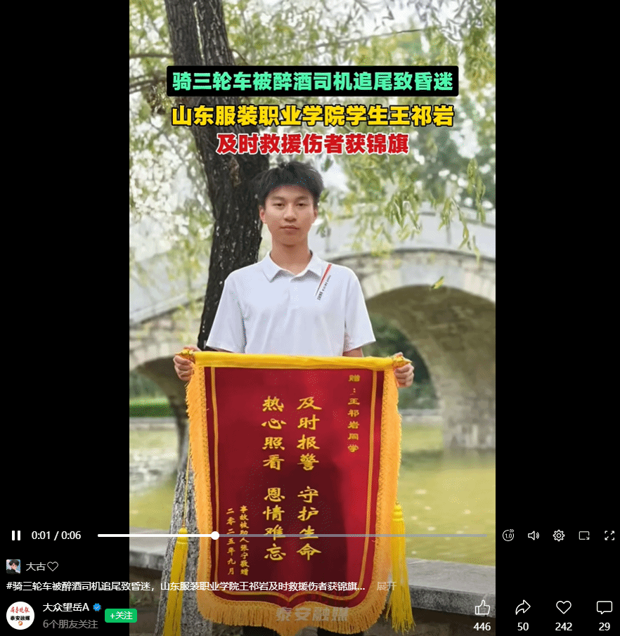 【大众望岳A】山东服装职业学院学生王祁岩及时救援伤者获锦旗