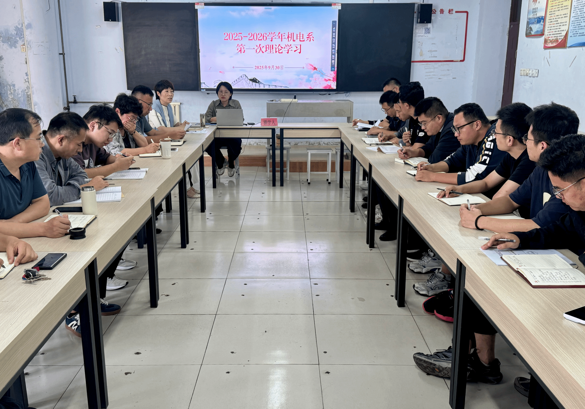为精准把握职业教育高质量发展导向,9月30日,机电系开展2025-2026学年第一次理论学习活动,专题学习《中国特色高水平高职学校和专业建设计划(2025—2029年)》(以下简称第二期“双高计划”)文件精神。系党总支书记杨中焕主持会议,主任巩振全、副主任胡晓亮及骨干教职工参会。