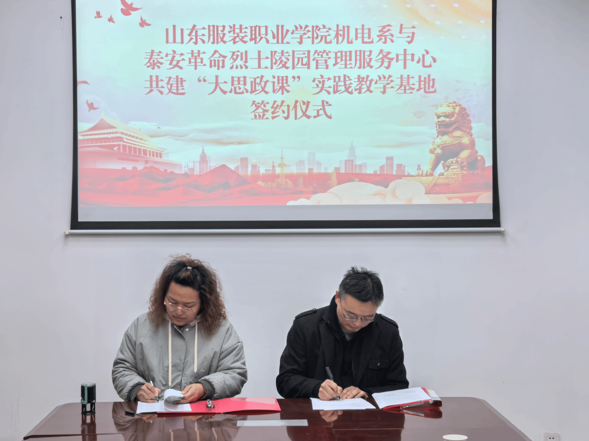 为深入贯彻落实新时代爱国主义教育要求,推动“大思政课”建设走深走实,1216日,机电系与泰安革命烈士陵园管理服务中心隆重举行“大思政课”实践教学基地结对共建签约揭牌仪式。机电系副主任胡晓亮、辅导员、学生代表,泰安革命烈士陵园管理服务中心宣教科科长杨丽娟、副科长袁磊等共同出席。