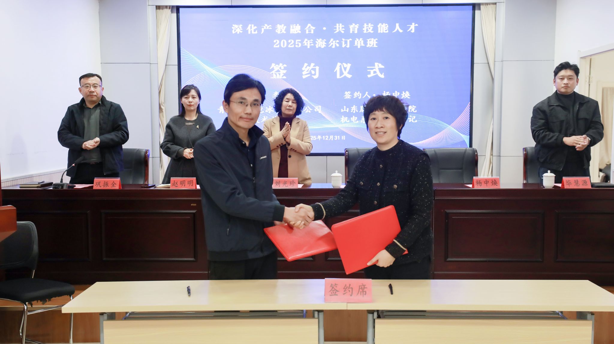 12月31日,山东服装职业学院2025年海尔订单班签约仪式举行,校企合作共育智能制造人才。学院党委委员、副院长刘光珍出席青岛海尔电冰箱有限公司技术总监李同祥、学院招生与就业指导办公室主任赵明明、机电系党总支书记杨中焕及机电系师生代表参加签约仪式。机电系主任巩振全主持仪式。