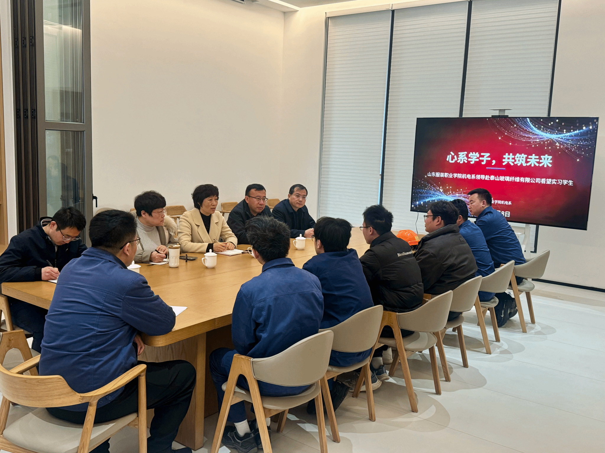 1月8日,机电系党总支书记杨中焕、主任巩振全带领教学管理科科长周静及教师代表一行,赴泰山玻璃纤维有限公司开展访企慰问交流活动,实地看望实习学生,并就深化产教融合、协同育人机制与企业进行对接。泰山玻璃纤维有限公司组织人事与企业管理部招聘经理杨勇等人予以热情接待。