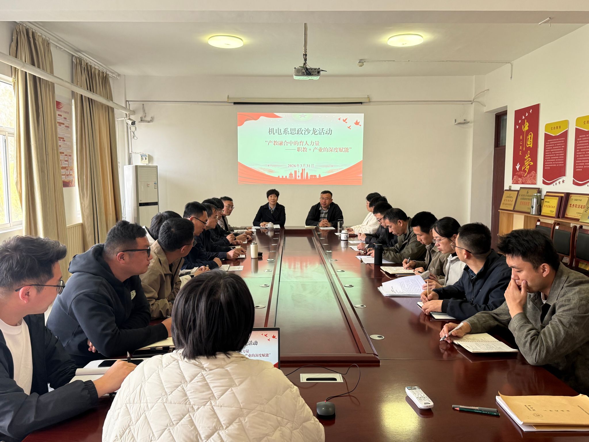 为全面落实《教育部关于深化职业教育教学关键要素改革的意见》(教职成〔2026〕1号)部署要求,打破思政教育与专业教育壁垒,推动产教融合与思政育人同向发力,3月31日,机电系成功举办“产教融合中的育人力量——职教+产业的深度赋能”专题思政沙龙活动。机电系党总支书记杨中焕主持,系主任巩振全、副主任胡晓亮及骨干教师参会。