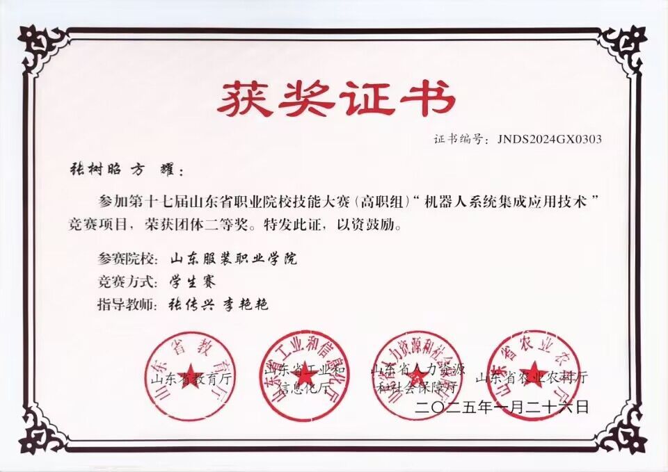 机电系学子张树昭、方耀获第十七届山东省职业院校技能大赛(高职组)“机器人系统集成应用技术”竞赛项目团体二等奖