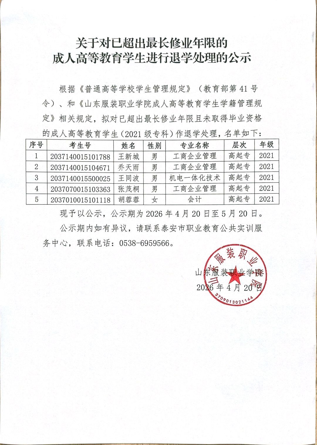 关于对已超出最长修业年限的成人高等教育学生进行退学处理的公示