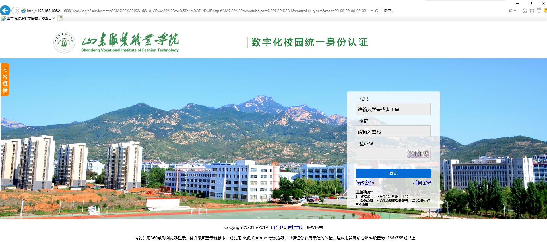 1、电脑正常连接网络后,打开浏览器(推荐使用IE浏览器,禁止使用360浏览器),会自动弹出数字化校园统一身份认证系统的登陆界面。