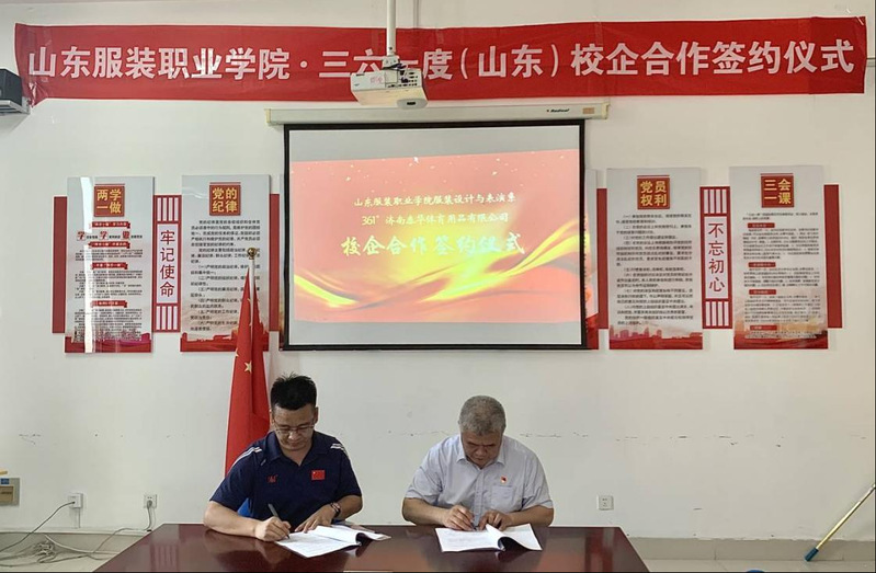 为促进毕业生更充分、高质量就业,进一步推动产教融合,深化校企合作,6月4日下午,服装设计与表演系与361°济南泰华体育用品有限公司校企合作签约仪式在文化艺术中心3019会议室举行。服装设计与表演系主任李金强,系党总支书记丁钢及相关专业负责人参加仪式,李金强与企业代表签署校企合作协议书并为“校企合作基地”揭牌。